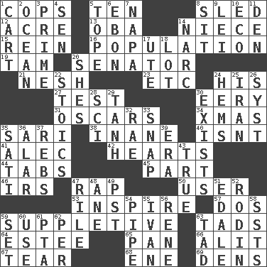 ACROSS 1. 911 reaches them 5. "___ Little Indians" 8. Downhill vehicle 12. Land measure 13. Chief or king in Benin or Nigeria 14. Sibling's daughter 15. It's straight from the horse's mouth 16. Census information 19. Scottish cap 20. Legislator 21. Delicate 23. And so on (abbr.) 24. Part of HMS, perhaps 27. Trial 30. Suggestive of the supernatural 31. Motion picture awards 34. Dec. holiday 35. Indian skirt 38. Empty; void 40. Is not 41. Actor Baldwin 42. Centers 44. Bar bills 45. Component 46. Big collection agency 47. Strike 50. One who uses or employs something 53. Motivate 57. Two (Sp.) 59. Supplying deficiencies 63. Bits 64. First name in cosmetics 65. Baking dish 66. Came down and settled, as after flight 67. Lacerate 68. Compass dir. 69. Hiding places for outlaws DOWN 1. Haul 2. Sea 3. First class 4. Elected rep. 5. Drink excessively 6. Inky black, to poets 7. California wine valley 8. Be seated 9. Luau accessory 10. Environmental prefix 11. Lair 14. Drug cop 17. Shoshoni 18. Car dealer's back yard 20. "______ My Girl" (Turtles hit) 22. Unemotional ones 24. Equivocates 25. SW Asia republic 26. System (abbr.) 28. _-fi 29. Hyperbolic tangent 30. Has an existence 32. Actress Charlotte 33. Fastener 35. Suttee (variant) 36. Having or resembling wings 37. Confederate soldiers (slang) 39. Period 43. Loyal 47. Cause heat under the collar 48. One (Scot) 49. Pacific Standard Time (abbr.) 51. Peak District village in England 52. "The Thinker" sculptor 54. Corncob 55. _ the terrible 56. French philosopher Descartes 58. Fast planes 59. Put into a specified state 60. Purpose 61. Parent Teacher Association (abbr.) 62. For each 63. Bit