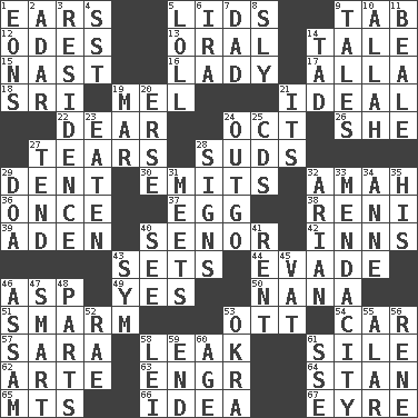 ACROSS 1. Hearing organs 5. Flaplike coverings 9. Bar bill 12. Lyric poems 13. Taken by mouth 14. Lie 15. Political cartoonist Thomas 16. Kenny Rogers chart-topper in '80 17. Silent film actress Nazimova 18. _ Lanka 19. Cartoonist voice _ Blanc 21. Perfect 22. Letter starter 24. Sep. follower 26. A female animal or person 27. Pulls apart 28. Beer foam 29. Gouge 30. Gives off 32. Housemaid 36. Single time 37. Ovum 38. Painter Guido (1575-1642) 39. An important port of Yemen 40. Sir (Sp.) 42. Restaurants 43. Arranges properly for use 44. Dodge 46. Cleo's killer 49. Consenting reply 50. Nanny 51. Excessive but superficial compliments 53. Baseball player Mel 54. Auto 57. "Two Mules for Sister ____" 58. Path through which fluid escapes 61. Filth; sediment 62. Johnson of "Laugh-In" 63. Engineer (abbr.) 64. Comedian Laurel of Laurel & Hardy 65. Mountains (abbr.) 66. The main thing one is thinking about 67. Jane of fiction DOWN 1. Immeasurably long periods of time 2. The sixth month of the Jewish calendar 3. Dwelling 4. Fast jet (abbr.) 5. Hang loosely or laxly 6. Retirement account (abbr.) 7. June honoree 8. Playfully artful 9. Falsehoods 10. Assad's deity 11. Memphis, Tenn. Street 14. Small boy 19. Spoil 20. Celtic language 21. ___ a Wonderful Life 23. Eroded 24. Expenditure 25. Music discs 27. Watch over 28. Attaches a signature 29. ___ good deed 31. Confronts 32. Believer in; advocate of (suffix) 33. Ananias' fault 34. Queen of England 1702-14 35. Part of HMS, perhaps 40. Perceive with the eye 41. Monthly bill 43. Symbol (abbr.) 45. Large container 46. Indian state 47. Don Adams' spy role 48. Pieces 52. Actress Charlotte 53. Gumbo ingredient 55. Having or resembling wings 56. French philosopher Descartes 58. Flowery wreath 59. Conclude 60. Mature 61. Compass dir.