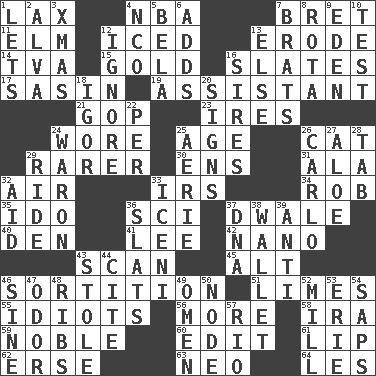 ACROSS 1. Not strict 4. Basketball assoc. 7. Cy Young winner Saberhagen 11. Shade tree 12. On the rocks 13. Wear away 14. Federal power corp. 15. Gilt 16. Chalkboards 17. Indian antelope 19. Aide 21. Republican Party 23. Angers 24. Had on 25. Mature 26. Domesticated feline 29. Less widely known 30. Followers of ems 31. Wing 32. Wind 33. Big collection agency 34. Director Reiner 35. Wedding promise 36. _-fi 37. A sleeping potion; an opiate (poet.) 40. Lair 41. Area sheltered from the wind 42. Billionth: prefix 43. Examine minutely or intensely 45. Keyboard modifier key 46. Determination 51. Citrus fruits 55. Foolish or stupid persons 56. Greater amount 58. Retirement account (abbr.) 59. Having high moral qualities 60. Prepare for publication 61. Mouth edge 62. Celtic language 63. Modern: prefix 64. French article DOWN 1. Allows 2. Inventor's middle name 3. Dec. holiday 4. Non-commissioned officer (abbr.) 5. Actor Lugosi 6. Does sums 7. Naughty children 8. Roll call or roster of names 9. Locale of original sin 10. Trial 12. Fail to notice 13. Otherwise 16. Titles for men of rank and authority 18. Russian composer Stravinsky 20. Signals 22. For each 24. Make _____ (do battle with) 25. Nest on high 26. Monte _, Las Vegas Hotel/Casino 27. _ vera 28. Bar bill 29. Travel on or in a vehicle 32. Help 33. Ancient Celtic tribe of eastern Britain 36. Narrow boards 37. Heredity factor (abbr.) 38. Place for singles 39. Against 43. Fur scarf 44. Quote 46. Trig term 47. Scent 48. Chest bones 49. Sign of something about to happen 50. Connecting point 52. Place where flour is made 53. One of the Great Lakes 54. Plant excrements 57. River (Sp.)