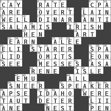 ACROSS 1. Island 4. Pace 8. Accounting whiz (abbr.) 11. "We ___ not amused" (Victoria) 12. Unconcealed 14. (Had) reclined 15. Not ill 17. Middle Eastern gold or silver currency 18. Opposed to 19. Deli grouping 21. From or relating to Ireland 23. Layer 24. Nonscientific branch of learning 25. Merit 27. Toward shelter 30. Biblical high priest 31. A viewer who gazes fixedly 34. Health resort 37. Flaplike covering 38. Leaves out 39. Period of immesurable duration 40. Perceive with the eye 41. Makes clutter 43. White ___ sheet 44. French philosopher Descartes 45. Small island 47. Australian flightless bird 49. Everything 50. Contemptuous expression 52. Orator 56. Domed church section 57. Potato state 60. Past tense of be (plural) 61. Tense 62. Prevent from occurring 63. Cards in a Roman deck? 64. One (Scot) 65. A home for chicks 66. Writing instrument DOWN 1. Crow sounds 2. Length times width 3. Shout 4. "The Thinker" sculptor 5. Advice 6. "___ Little Indians" 7. Epoch 8. 2nd pers. sing. pres. of can (arch.) 9. Heart or essence 10. Black tropical American cuckoo 13. Three (prefix) 14. Den 16. Cowardly lion portrayer 20. Not women's 22. Actress Charlotte 25. Writer Wiesel 26. Helper 27. Get up 28. Allows 29. Celtic language 30. Raised railways 32. Heavy book 33. So be it 34. Lick closed 35. Airs 36. Santa ___, CA 42. Drop; flow; fall 44. Regret 46. Cole _ (cabbage dish) 47. Follow as a consequence or result 48. Rendezvous 49. To the left, to Queeg 50. Connect, as a bridge 51. To free from 52. "______ My Girl" (Turtles hit) 53. Seaweed 54. One of the Great Lakes 55. It's straight from the horse's mouth 56. "One Day ___ Time" 58. Lair 59. Had dinner
