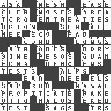 ACROSS 1. White ___ sheet 4. Delicate 8. Relaxation 12. "Mermaids" star 14. Olfactory organs 16. Type of rug 17. "Corrida" creature 18. Pleas 20. Greek mythologigal hunter 22. Elected rep. 23. The first octave above the treble staff 24. Born 25. Environmental prefix 28. Writing tablet 30. Drawstring 31. Yearns 35. Wind 37. Lyric poems 40. Rowboat 41. Trig term 42. Mexican monetary units 44. Island territory of the United States 45. Pulitzer Prize-winning author Ferber 46. Former U.S. Attorney General Janet 47. Followers of ems 48. Trials 50. High mountains 52. Hearing organ 54. To separate or throw off 55. Raised railways 58. Plant excrement 61. Director Reiner 63. Relating to the nose 65. Appease 70. Libertine 71. Von Bismarck 72. Auras 73. Made supply last 74. Trial 75. Settles 76. Big collection agency DOWN 1. Gambison 2. Dinah or Pauly 3. Nest on high 4. Compass dir. 5. Period of immesurable duration 6. Fast jet (abbr.) 7. Possessive pronoun 8. Consume 9. Operatic vocal solo 10. Sew up the eyelids of hawks and falcons 11. 90 degrees 13. Friend of Pooh 15. Ooze 19. Of or related to the anus 21. Modern: prefix 26. Riding implement 27. More peculiar 29. Evades 30. Make 32. Part of speech 33. Pate de foie ____ 34. Symbol (abbr.) 35. Helper 36. Lodging establishments 38. Compass dir. 39. Underwater navigation system 41. Put into a specified state 43. Not divided or shared with others 49. Indian skirt 51. Writing instrument 53. Writer of Portnoy's Complaint (1969) 55. 1973 Nobel Price Winner (Physics) Leo 56. Member of a famous L.A. basketball team 57. Bobsleighs 58. Blemish 59. Johnson of "Laugh-In" 60. Plant holders 62. Prejudice 64. "We ___ not amused" (Victoria) 66. Plant holder 67. Wing 68. Coat; cloak 69. Curvy letter