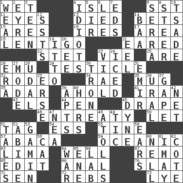 ACROSS 1. Dripping 4. Small island 8. Fast jet (abbr.) 11. Snake ____ (dice throw) 13. Passed on 14. Stakes 15. Ancient Greek god of war 16. Angers 17. Type of rug 18. Small, flat, pigmented spot on the skin 21. Having ears or earlike features 22. Proofreading order 23. Compete 25. "We ___ not amused" (Victoria) 26. Australian flightless bird 29. A testis 32. Cowboy competition 34. Actress Charlotte 35. Java container 38. The sixth month of the Jewish calendar 39. Hold, grip (Informal) 41. SW Asia republic 43. Raised railways 44. Writing instrument 45. Window treatment 46. Plea 50. Allow 51. Label 54. Double-curved letter 55. Prong on a fork 57. Phillipine bananalike plant 59. Pertaining to the sea 63. Pale green bean 64. Water source 67. San ____ (Riviera town) 68. Prepare for publication 69. Of or related to the anus 70. Narrow board 71. Elected rep. 72. Confederate soldiers (slang) 73. Sodium hydroxide DOWN 1. Welt 2. Jane of fiction 3. Adolescent 4. Foolish or stupid persons 5. Title for a knight 6. Area sheltered from the wind 7. Begley and Asner 8. Father Junipero _ 9. Bull 10. Sadhe (variant) 12. Fast planes 14. Sound made by sheep 19. "Tell ____ the Marines!" 20. Unit of force equal to gravity 21. Snakelike fish 23. Small bottle 24. On the rocks 26. Period 27. Method 28. Hereditary estate 30. Marketplace scale 31. Independent ruler or chieftain 33. Celtic language 36. Mountain range 37. Open wide 39. Tenement units (abbr.) 40. Possessive pronoun 42. Remaining after all deductions 45. Centimeter-gram-second unit of force 47. Teachers' org. 48. Ringlike coral islands and reefs 49. Nervous spasm 51. Stories 52. Remain 53. Homeless child 56. Hearing organs 58. Domesticated feline 60. 1994 drama film starring Jodie Foster 61. "If ____ say so..." 62. ____ d'Azur (French Riviera) 64. Armed conflict 65. Compass dir. 66. Experiment locale