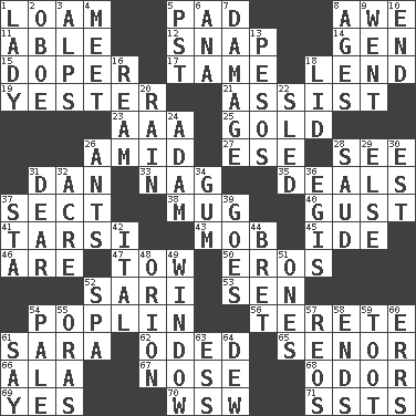 ACROSS 1. Rich soil 5. Groovy apt. 8. Deep reverence 11. Competent 12. Fastener 14. Commissioned mil. rank 15. Drug addict 17. Not wild 18. Grant temporary use of 19. Next before 21. Help 23. American Automobile Association (abbr.) 25. Gilt 26. Among 27. Compass dir. 28. Perceive with the eye 31. One of the 12 tribes of Israel 33. Tired old horse 35. Allots cards 37. Religious group 38. Java container 40. Abrupt rush of wind 41. Tarsus (plural) 43. Crowd into 45. Binary compound 46. "We ___ not amused" (Victoria) 47. Pull behind 50. Greek god of love 52. Indian skirt 53. Elected rep. 54. Cotton for raincoats, e.g. 56. Cigar-shaped 61. "Two Mules for Sister ____" 62. Wrote a lyric poem 65. Sir (Sp.) 66. Chicken ___ king 67. Olfactory organ 68. Aroma 69. It is so 70. Compass dir. 71. Fast planes DOWN 1. Kenny Rogers chart-topper in '80 2. Mitch Miller's instrument 3. High mountains 4. Confront 5. Pacific Standard Time (abbr.) 6. Santa ___, CA 7. Break 8. Eras 9. Gone 10. Conclusion 13. Mexican monetary units 16. 480, 500 or 516 sheets of paper 18. Hat (slang) 20. Precipitation 22. Downhill vehicle 24. First of billions? 26. Pismires 28. Saudi Arabian king (1953-1964) 29. Otherwise 30. Eastern Standard Time (abbr.) 31. Letter starter 32. Measure of real estate 34. Chewing product 36. The front part of a cuirass 37. R.R. building 39. Leaves 42. Slanted text style (abbr.) 44. Cy Young winner Saberhagen 48. Constellation of myth 49. Light entry point 51. Singles 52. Health resort 54. Diluted with white 55. Mouths or openings 57. Vintage cars 58. Conclusions 59. A blast of a horn 60. Blunders 61. Declare 63. Curvy letter 64. Morning condensation