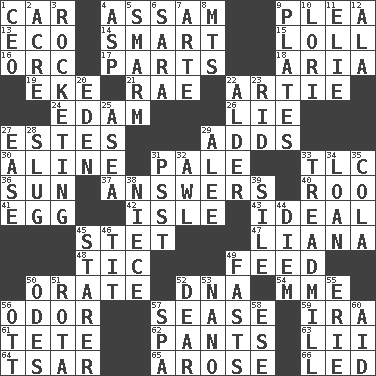 ACROSS 1. Auto 4. Indian state 9. Entreaty 13. Environmental prefix 14. Don Adams' spy role 15. Hang loosely or laxly 16. The grampus (Milton) 17. Pieces 18. Roberta Peters solo 19. Supplement with great effort 21. Actress Charlotte 22. Nick name for Arthur 24. Dutch treat 26. Falsehood 27. _____ Park, CO 29. Sums up 30. Place in a line 31. Light colored 33. Affectionate concern, for short 36. Player for Phoenix 37. Statements in reply to questions 40. Friend of Pooh 41. Oval reproductive body of a fowl 42. Capri or Wight 43. Standard of perfection 45. Proofreading order 47. Climbing, woody, usually tropical vines 48. Nervous spasm 49. Nourish 50. Speak pompously 52. Heredity factor (abbr.) 54. Madame (abbr.) 56. Aroma 57. Gospel singer Marvin 59. Lyricist Gershwin 61. Wig 62. Leg coverings 63. Cards in a Roman deck? 64. Russian ruler of old 65. Came up 66. Directed DOWN 1. Corporate head (abbr.) 2. Land measure 3. Shooting up abruptly 4. Viper 5. Excessive but superficial compliments 6. "Two Mules for Sister ____" 7. Johnson of "Laugh-In" 8. Mountains (abbr.) 9. Food holders 10. Australian parrot (variant) 11. Writer Wiesel 12. In the manner of 20. Locale of original sin 22. Tree or shrub in the Birch family 23. To free from 25. Toward the sea 27. Relaxation 28. Strike heavily 29. Toward shelter 31. Inconspicuous attention getter 32. Leather borer 33. Excercise machine 34. Grant temporary use of 35. Root beer relative 38. Sibling's daughter 39. Filth; sediment 44. South Vietnam president (1954) 45. A viewer who gazes fixedly 46. Teat (slang) 49. Goes without food and/or water 50. Lyric poems 51. Roll call or roster of names 52. Letter starter 53. Billionth: prefix 55. 4th largest of the Great Lakes 56. Baseball player Mel 57. Health resort 58. Compass dir. 60. Assist