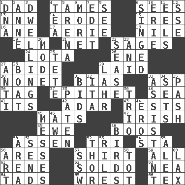 ACROSS 1. June honoree 4. Softens 9. Perceives with the eye 13. Compass dir. 14. Eat (away) 15. Angers 16. One (Scot) 17. Nest on high 18. The longest river in the world 19. Shade tree 21. Remaining after all deductions 22. Gurus 24. Globular water bottle used in Asia 26. Compass dir. 27. Tolerate 29. Put down 30. Music written for nine 31. Prejudice 33. Cleo's killer 36. Label 37. Curse 40. Ocean 41. It is 42. The sixth month of the Jewish calendar 43. Musical pauses 45. Floor coverings 47. From or relating to Ireland 48. She-sheep 49. Scornful sounds 50. NE Netherlands city 52. Three (prefix) 54. R.R. building 56. Ancient Greek god of war 57. Chest covering 59. 100% 61. French philosopher Descartes 62. Twentieth part of a lira 63. Teachers' org. 64. Bits 65. Take or capture by force 66. John Ritter's dad DOWN 1. Heredity factor (abbr.) 2. Singer Murray 3. Residences 4. Beverage made from leaves 5. Sports stadium 6. Greater amount 7. Prepare for publication 8. Perceive with the eye 9. Scorched 10. 4th largest of the Great Lakes 11. Snakelike fish 12. Compass dir. 20. Method 22. Gospel singer Marvin 23. Cuckoo 25. False hair 27. Opposed to 28. Water vessel 29. Cowardly lion portrayer 31. Auction offers 32. Call ___ day 33. Aide 34. Puts into a specified state 35. Romantic infatuation 38. Eucharist need 39. Musical group of three 44. Greek god of love 45. Makes clutter 46. Deep reverence 49. Avian creatures 50. Type of rug 51. Post 52. Son of Odin 53. Cause heat under the collar 55. Toward shelter 56. Tate display 57. Compass dir. 58. Small child 60. Not strict