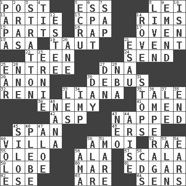 ACROSS 1. Mail 5. Curvy letter 8. Luau accessory 11. Nick name for Arthur 13. Tax preparer (abbr.) 14. Basketball hoops 15. Actors' quests 16. Reproach for some lapse or misdeed 17. Baking chamber 18. White ___ sheet 19. Drawn tight 21. Happening 22. Adolescent 24. Post 25. Main course 27. Heredity factor (abbr.) 29. Soon (poet.) 30. To get out of a bus 32. Painter Guido (1575-1642) 33. Woody, climbing, usually tropical plant 35. Lie 39. Foe 41. Sign of something about to happen 42. Viper 43. Slept 45. Connect, as a bridge 48. Celtic language 49. Country residence 50. Mine, in Marseilles 52. Actress Charlotte 55. Butter sub 56. Chicken ___ king 57. Any of the three canals of the cochlea 59. Ear part 60. Make imperfect 61. _ Allan Poe 62. Compass dir. 63. "We ___ not amused" (Victoria) 64. Elected reps. DOWN 1. Dad 2. Mouths or openings 3. Ski resort town in Vermont 4. Teat (slang) 5. Shade of tan 6. Argument over a trivial matter 7. Plant excrement 8. Make or become more lively 9. Make improvements or corrections to 10. Is not 12. First name in cosmetics 14. Be footloose 20. A saturated hydrocarbon 21. Son of Isaac 23. Bert's buddy 25. Hearing organ 26. Compass dir. 27. Lair 28. Basketball assoc. 30. 24 hours 31. Halts 33. French article 34. Mischievous child 36. Electrical Measurement 37. Area sheltered from the wind 38. Conclusion 40. Grandmother 43. Modern: prefix 44. Get up 45. Grain storage towers 46. Military trainee 47. Medicinal plant 49. Short-tailed, large-bodied rat 50. Having or resembling wings 51. Female horse 53. Actor Alda or Thicke 54. Hearing organs 56. Housemaid (var.) 58. Music discs