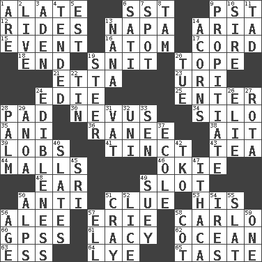 ACROSS 1. Having winglike extensions 6. Fast jet (abbr.) 9. Pacific Standard Time (abbr.) 12. Amusement-park features 13. California wine valley 14. Operatic vocal solo 15. Happening 16. Smallest unit of an element 17. Drawstring 18. Conclusion 19. In a ____ (agitated or irritated) 20. Drink excessively 21. Singer James 23. RI univ. 24. Singer Brickell 25. Keyboard key 28. Writing tablet 30. Congenital growth or mark on the skin 34. Grain storage tower 35. Cuckoo 36. The wife of a rajah (variant) 38. Small island 39. Tennis shots 41. A color or tint 43. Afternoon social gathering 44. Promenades 46. Migrant worker of the '30s 48. Ewer handle 49. Notch 50. Against 51. A slight indication 53. Part of HMS, perhaps 56. Toward shelter 57. One of the Great Lakes 58. Monte _, Las Vegas Hotel/Casino 60. Global Positioning Systems (abbr.) 61. Made of lace 62. Sea 63. Curvy letter 64. Potassium hydroxide 65. Clothes sense DOWN 1. "We ___ not amused" (Victoria) 2. Moving, as bait 3. Arabian gulf 4. Watched over 5. Eastern Standard Time (abbr.) 6. Suttee (variant) 7. Specific locale 8. Scottish cap 9. Conciliate 10. Title for a man of rank and authority 11. Small amount or degree 13. Nanny 14. Oak nuts 19. Guide 20. Third day of the wk. 22. Metal container 24. The property of being fit to eat 26. Writer Wiesel 27. Round or rotation of duties 28. Inside of hand 29. Small Philippine buffalo 31. Large container 32. Corn or form start 33. Elected rep. 37. Learning spot: Fr. 40. Chalkboards 42. Ring climax 45. Indian title of respect (Mr.) 47. New York city 49. Chop _ 50. High mountains 51. Supercomputer manufacturer 52. Louse (plural) 54. Angers 55. Narrow board 56. Grow older 57. Pipe bend 58. Small bed 59. Single