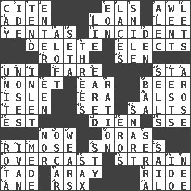 ACROSS 1. Quote 5. Raised railways 8. Leather borer 11. An important port of Yemen 12. Rich soil 13. Area sheltered from the wind 14. Gossips 17. Event 19. Keyboard key 21. Chooses 22. Writer of Portnoy's Complaint (1969) 23. Elected rep. 24. Single; one (prefix) 27. Conductor's collection 29. R.R. building 32. Music written for nine 34. Hearing organ 36. Fermented drink made from hops 37. Capri or Wight 38. Period 39. In addition 40. Adolescent 41. Arrange properly for use 42. Table seasonings 43. Eastern Standard Time (abbr.) 44. South Vietnam president (1954) 46. Compass dir. 47. At this time 50. Mouths or openings 52. Full of chinks, cracks, or crevices 55. Sounds asleep 57. Cloudy 59. Put through a sieve 62. Small amount or degree 63. Like ___ of sunshine 64. Travel on an animal 65. A saturated hydrocarbon 66. Acura sports coupe 67. Medicinal plant DOWN 1. Island 2. Binary compound 3. Be inclined (to) 4. Keyboard key 5. A really long time 6. Shoestrings 7. Grin 8. Actor Baldwin 9. Left 10. Allows 12. Untruth 15. Upward 16. Stalk of a moss capsule 18. Lair 20. Threesomes 24. Join together 25. Olfactory organs 26. An arm off of a larger body of water 28. Having ears or earlike features 29. Exchanges for money 30. Trials 31. Came up 33. Car or cant ending 35. Food allowance for one day 36. Sound made by sheep 42. Don Adams' spy role 45. Greek god of love 47. And not 48. Witty Wilde 49. Puts on (as clothing) 51. Spanish missionary in California 52. Round or rotation of duties 53. _ the terrible 54. Ancient Persian 55. Filthy place 56. Move on water 58. Saxophone 60. Wedding promise 61. Born
