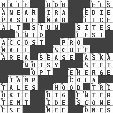 ACROSS 1. Nathan's nickname 5. Director Reiner 8. Raised railways 11. Approach 13. Lyricist Gershwin 14. Singer Brickell 15. Thick mixture 16. Make imperfect 17. Louse (plural) 18. Keyboard modifier key 19. Surprise greatly 21. Settings 22. To the inside or interior of 24. For fear that 25. Buttonhole 27. Adept person 29. Shopping center 30. Scutum 32. Length times width 33. Gospel singer Marvin 35. "____ silly question..." 39. Annoyingly loud 41. Proofreading order 42. Choose 43. Develop 45. Pack (down) 48. Root beer relative 49. Falsehoods 50. Parka part 52. Three (prefix) 55. Migrant worker of the '30s 56. Of large size 57. Keyboard key 59. Portable shelter 60. Binary compound 61. Biscuitlike quick bread 62. Compass dir. 63. Born 64. Washington bills DOWN 1. California wine valley 2. Of or related to the anus 3. A testis 4. Ingest 5. Tall New Zealand timber tree 6. NW Algerian seaport 7. Soap unit 8. Proofreads 9. It is permitted: Lat. 10. Perceives with the eye 12. Musical pauses 14. Writer Wiesel 20. Small child 21. Slit 23. Pitcher Ryan 25. Housemaid (var.) 26. 4-wheeled motor vehicle 27. Personal Computers (abbr.) 28. Regret 30. Declare 31. Artist's stand 33. Small drink 34. Eastern Standard Time (abbr.) 36. Ski resort town in Vermont 37. Cask 38. Had dinner 40. I made a mistake 43. Environmental prefix 44. Methods 45. Proceeds 46. Place in a line 47. Confront 49. Carry 50. Flintstone garb 51. Double curve, resembling the letter S 53. French philosopher Descartes 54. Angers 56. Storage container 58. Non-commissioned officer (abbr.)