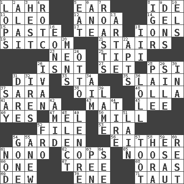 ACROSS 1. Cowardly lion portrayer 5. Hearing organ 8. Binary compound 11. Butter sub 12. Small Philippine buffalo 14. Set 15. Thick mixture 17. Rend 18. Charged atoms 19. "Cheers" or "Ellen" 21. Flight of steps 23. Modern: prefix 25. Native american tent (variation) 26. Is not 27. Put into a specified state 28. Air pressure measure (abbr.) 31. HTML Container Element 33. R.R. building 35. Killed 37. "Two Mules for Sister ____" 38. Petroleum 40. Rounded earthenware pot or jar 41. Sports stadium 43. Floor protector 45. Area sheltered from the wind 46. It is so 47. Cartoonist voice _ Blanc 50. Place where flour is made 52. Do some clerical work 53. Period 54. Place where plants grow 56. One or the other 61. Words to Nanette 62. 911 reaches them 65. Trap for birds or small mammals 66. Single 67. Woody plant 68. Mouths or openings 69. Morning condensation 70. Compass dir. 71. Tense DOWN 1. Chops off 2. Jai _ 3. Command 4. College mil. group 5. Erode 6. A saturated hydrocarbon 7. Exposes to great heat 8. Russian composer Stravinsky 9. Hiding places for outlaws 10. Raised railways 13. Nick name for Arthur 16. Immeasurably long periods of time 18. One more than two 20. Not women's 22. Tenement units (abbr.) 24. Von Bismarck 26. _ the terrible 28. Diluted with white 29. Drop; flow; fall 30. _ tizzy (2 wds.) 31. Have the gumption 32. Angers 34. Direct toward a target or goal 36. Hang loosely or laxly 37. Declare 39. Unable to walk 42. Among 44. Become fatigued 48. Opt 49. Poe poem 51. (Had) reclined 52. Back 54. Went 55. Afresh 57. A blast of a horn 58. Israeli folk dance 59. He sold his birthright 60. Take ten 61. Allow head to fall sleepily 63. Animal enclosure 64. Perceive with the eye