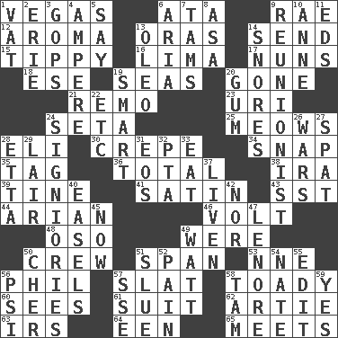 ACROSS 1. Viva Las _ 6. "One Day ___ Time" 9. Actress Charlotte 12. Scent 13. Mouths or openings 14. Post 15. Likely to tip or tilt 16. Pale green bean 17. Religious women 18. Compass dir. 19. Oceans 20. Went 21. San ____ (Riviera town) 23. RI univ. 24. Stalk of a moss capsule 25. Catcalls? 28. Biblical high priest 30. Streamer paper 34. Fastener 35. Label 36. "_____ Recall" 38. Retirement account (abbr.) 39. Prong on a fork 41. Smooth fabric 43. Fast jet (abbr.) 44. Believer in; advocate of (suffix) 46. Electrical Unit 48. Bear (Spanish) 49. Past tense of be (plural) 50. Ship's personnel 51. Connect, as a bridge 53. Compass dir. 56. Silvers or Donahue 57. Narrow board 58. Sycophant 60. Observes 61. Set or collection 62. Nick name for Arthur 63. Big collection agency 64. Car or cant ending 65. Confronts DOWN 1. Large container 2. 4th largest of the Great Lakes 3. Republicans 4. Electrical Unit 5. Declare 6. Operatic vocal solo 7. Scottish caps 8. White ___ sheet 9. One who advocates reunion 10. Singer Murray 11. Begley and Asner 13. Butter sub 14. Sounds asleep 19. Don Adams' spy role 20. Chewing product 22. And so on (abbr.) 24. Seigniories (variant) 26. Armed conflicts 27. Petty quarrel 28. Singer James 29. Den 31. Greek goddess of the dawn 32. Parent Teacher Association (abbr.) 33. Ingest 37. Make or become more lively 40. Artist's stands 42. And not 45. Immediately 47. Poe poem 49. Electrical Unit 50. "Mermaids" star 51. Change direction abruptly 52. Ache 54. Nathan's nickname 55. Prepare for publication 56. Air pressure measure (abbr.) 57. Compass dir. 58. Scottish cap 59. Consenting reply