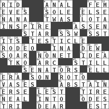ACROSS 1. To free from 4. Of or related to the anus 8. Opposite of masc. 11. Nights before holidays 13. Not divided or shared with others 14. Otherwise 15. Grandmother 16. It was, poetically 17. Globular water bottle used in Asia 18. Stimulate to action 21. NE Netherlands city 22. Play the lead 23. Compass dir. 25. Fast jet (abbr.) 26. ___ a Wonderful Life 29. A testis 32. Cowboy competition 34. _ tizzy (2 wds.) 35. Morning condensation 38. Fly high 39. Music written for nine 41. The main thing one is thinking about 43. Ring climax 44. Curve 45. Free from disturbance or agitation 46. Legislators 50. Pipe bend 51. Period 54. Manchild 55. Printing process, for short 57. Flower holders 59. Choose not to consume 63. Celtic language 64. For fear that 67. Become fatigued 68. Anneal 69. To the inside or interior of 70. Lyric poems 71. Three (prefix) 72. Letter starter 73. Eastern Standard Time (abbr.) DOWN 1. Painter Guido (1575-1642) 2. "Terrible" tsar 3. Hiding places for outlaws 4. Michaelmas daisies 5. At this time 6. Insect wing 7. French article 8. Soft thread for cleaning between teeth 9. _____ Park, CO 10. Intended 12. Plant excrements 14. Raised railways 19. "Tell ____ the Marines!" 20. Actress Charlotte 21. Leather borer 23. Trig term 24. Scram! 26. Big collection agency 27. A blast of a horn 28. Neighbor of Neb. 30. Colored lightly or faintly 31. Prepare for publication 33. Greek god of love 36. Singer Brickell 37. Water source 39. Billionth: prefix 40. NW Algerian seaport 42. Everything 45. Fast planes 47. Double-curved letter 48. Speaker 49. Director Reiner 51. Happening 52. More uncommon 53. Slender Brazilian palm 56. Von Bismarck 58. Snakelike fish 60. Helper 61. Angers 62. Egg locale 64. Flaplike covering 65. Compass dir. 66. R.R. building