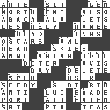 ACROSS 1. Johnson of "Laugh-In" 5. Be seated 8. Commissioned mil. rank 11. _ pole 13. Compass dir. 14. In addition 15. Phillipine bananalike plant 16. According to 17. Allows 18. French article 19. Have trust in 21. The wife of a rajah (variant) 22. Froth on beer 24. Taverns 25. Motion picture awards 27. Leather borer 29. Hitchcock's "____ Window" 30. Atmospheres 32. Queen of England 1702-14 33. Believer in; advocate of (suffix) 35. Carryall 39. Prevent from occurring 41. Deliberation 42. 24 hours 43. Keyboard key 45. Broke a traffic law 48. One who uses or employs something 49. Full of seeds 50. Position in a hierarchy or organization 52. To free from 55. Opposed to 56. Nilotic language 57. Elude 59. Left side of a ship or aircraft 60. Small island 61. Ingested 62. Indian title of respect (Mr.) 63. Parent Teacher Association (abbr.) 64. Afternoon social gatherings DOWN 1. Of or related to the anus 2. Loose flowing garment 3. File 13 4. And so on (abbr.) 5. Lick closed 6. In an inward manner 7. Beverage made from leaves 8. American astronaut and politician John 9. _____ Park, CO 10. Characteristic smell of wine 12. Ethiopian city, capital of Harari 14. Actor Alda or Thicke 20. Begley and Asner 21. Cause heat under the collar 23. Having ears or earlike features 25. Mouth or opening 26. Elected rep. 27. Alias (abbr.) 28. Acquire through effort 30. Title for a knight 31. Lacking originality or spontaneity 33. "One Day ___ Time" 34. Marina Del _, California 36. Make much ado about nothing 37. Teat (slang) 38. Compass dir. 40. Whirlpool 43. Superhero pair 44. First name in cosmetics 45. Sir (Sp.) 46. _ dish (used to culture cells) 47. Prepare for publication 49. Plant excrements 50. Costume for a special activity 51. Globular water bottle used in Asia 53. It may be bright or harebrained 54. Lairs 56. Pet locale 58. Large container