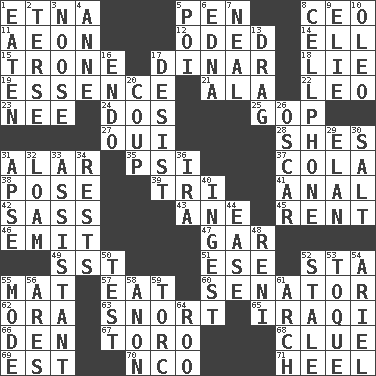 ACROSS 1. Inactive volcano in Sicily 5. Animal enclosure 8. Corporate head (abbr.) 11. Period of immesurable duration 12. Wrote a lyric poem 14. Pipe bend 15. Marketplace scale 17. Middle Eastern gold or silver currency 18. Whopper 19. Substance 21. Insect wing 22. Lion 23. Born 24. Two (Sp.) 25. Grand Old Party 27. Fr. "Yes" 28. "______ My Girl" (Turtles hit) 31. Having or resembling wings 35. 23rd letter of the Greek alphabet 37. Root beer relative 38. Introduce or present, as a question 39. Three (prefix) 41. Of or related to the anus 42. Backtalk 43. One (Scot) 45. Monthly bill 46. Give off 47. Slender fish 49. Fast jet (abbr.) 51. Compass dir. 52. R.R. building 55. Floor protector 57. Erode 60. Elected representative 62. Mouth or opening 63. Derisive sound 65. Resident of Iraq 66. Lair 67. "Corrida" creature 68. A slight indication 69. Eastern Standard Time (abbr.) 70. Non-commissioned officer (abbr.) 71. The bottom of a shoe or boot DOWN 1. Ingested 2. Laconic 3. Trap for birds or small mammals 4. Singer Murray 5. Luau course 6. Pulitzer Prize-winning author Ferber 7. Anneal 8. Portable communications device 9. Writer Wiesel 10. Margarine 13. To be drawn or hauled along 16. Inside; within (prefix) 17. Stop 20. Clever action or accomplishment 26. Witty Wilde 29. Liveliness 30. Table seasoning 31. Domed church section 32. Rich soil 33. Helper 34. Musical pauses 36. Lyricist Gershwin 40. Swallow 44. Comfort 48. Painter Guido (1575-1642) 50. Trial 52. Showing deterioration from age 53. Woman's close-fitting hat 54. Satellite of Uranus 55. Method 56. Ancient Greek god of war 58. At once, immediately (arch.) 59. Torque (variant) 61. Bowlike part 64. Friend of Pooh