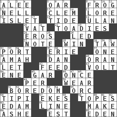 ACROSS 1. Toward shelter 5. Rowing implement 8. Tree-dwelling hopper 12. 1994 drama film starring Jodie Foster 13. Clement's nick name 15. Old wives' tales, e.g. 16. Small island 18. Periodic rise and fall of the sea level 19. ____ Bator, Mongolia 20. Large container 22. Sycophants 24. Greek god of love 26. Directed 27. Make mention of 28. Acquire through effort 29. The 23rd letter of the Hebrew alphabet 32. Left side of a ship or aircraft 35. 4th largest of the Great Lakes 37. Single 38. Nanny 39. One of the 12 tribes of Israel 40. NW Algerian seaport 41. Allow 42. Nourish 43. Electrical Unit 44. Compass dir. 45. Slender fish 46. Single time 49. For each 50. Erode 51. Mood resulting from idleness 55. The grampus (Milton) 56. Native american tent (variation) 57. Makes supply last 59. Drinks excessively 63. Dutch treat 64. Actor's bit 65. Cause to be 66. American tennis player Robert 67. Eastern Standard Time (abbr.) 68. Paradise DOWN 1. Black tropical American cuckoo 2. French article 3. Pipe bend 4. Veterans Day date 5. Sep. follower 6. Set down 7. Do over again 8. Watery 9. Hero or heavy, e.g. 10. Mouths or openings 11. Commissioned military rank (abbr.) 14. Ear of corn 17. Edible starchy tuberous root 21. Small child 23. Lair 25. Sowing specialist 28. Light entry point 29. "Corrida" creature 30. Of or related to the anus 31. Left 32. Light colored 33. Presage 34. Assign a rank or rating to 36. Actress Charlotte 40. Conquer 42. Pack 45. Unit of force equal to gravity 47. Modern: prefix 48. Draw slowly or heavily 49. First class 51. Auction offers 52. Brightly colored fish 53. Migrant worker of the '30s 54. Not women's 56. Beverage made from leaves 58. Put into a specified state 60. Writing tablet 61. Make supply last 62. Elected rep.