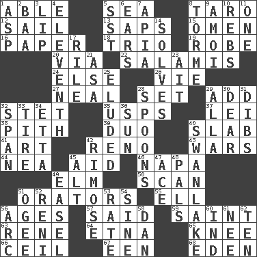 ACROSS 1. Competent 5. Ocean 8. Edible starchy tuberous root 12. Travel by water 13. Plant excrements 15. Sign of something about to happen 16. Some stationery 18. Musical group of three 19. Loose flowing garment 20. By way of 22. Deli grouping 24. Otherwise 26. Compete 27. Be tempered by heat 28. Put into a specified state 29. Increase 32. Proofreading order 35. United States Postal Service (abbr.) 37. Luau accessory 38. Heart or essence 39. Superhero pair 40. Broad, flat, thick piece 41. Nonscientific branch of learning 42. Former U.S. Attorney General Janet 43. Armed conflicts 44. Teachers' org. 45. Assist 46. California wine valley 49. Shade tree 50. Skim 51. Speakers 55. Pipe bend 56. Eras 57. Alleged 59. Inhabitant of Heaven 63. French philosopher Descartes 64. Inactive volcano in Sicily 65. Leg joint 66. To provide with a ceiling 67. Car or cant ending 68. Locale of original sin DOWN 1. Cleo's killer 2. Sound made by sheep 3. Mouth edge 4. Veterans Day date 5. Fast jet (abbr.) 6. Hearing organs 7. Capital of Western Samoa 8. Singer Mel 9. Mine, in Marseilles 10. Confederate soldiers (slang) 11. Single 14. Finds the solution 17. Cause heat under the collar 21. White ___ sheet 23. Small island 25. Dodged 28. Soup utensils 29. Silent film actress Nazimova 30. Letter starter 31. Claim 32. Connect, as a bridge 33. Hoop that covers a wheel 34. Singer James 36. Player for Phoenix 40. Tchaikovsky ballet 42. Full of chinks, cracks, or crevices 45. The first octave above the treble staff 47. Adept person 48. Friends 49. Artist's stand 51. Double curve, resembling the letter S 52. Painter Guido (1575-1642) 53. Pace 54. Trig term 56. Curve 58. Daniel's nick name 60. Indiana (abbr.) 61. Born 62. Nine, plus one