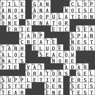 ACROSS 1. Do some clerical work 5. Separate the seeds from cotton 8. Hoof sound 12. Small Philippine buffalo 13. Santa ___, CA 14. Annoying sound 15. Political cartoonist Thomas 16. Census information 19. Single 20. Legislator 21. One of the Great Lakes 23. And so on (abbr.) 24. Ocean 27. Canvas cover 30. Connect, as a bridge 31. Cause to be 34. A home for chicks 35. Hyperbolic tangent 38. Dodge 40. Lyric poems 41. Medicinal plant 42. Manatee 44. Floor coverings 45. Greater amount 46. Sliced dessert 47. Large container 50. The sixth month of the Jewish calendar 53. Speakers 57. Set 59. Supplying deficiencies 63. Celtic language 64. First name in cosmetics 65. Lair 66. Arranges properly for use 67. Pull apart 68. Compass dir. 69. Trial DOWN 1. Papal veil 2. Silly 3. Failure 4. Erode 5. Yawn 6. Soon (poet.) 7. California wine valley 8. Small bed 9. Cards in a Roman deck? 10. Bear (Spanish) 11. Fenced enclosure 14. Drug cop 17. Shoshoni 18. Car dealer's back yard 20. Dry up 22. Skin irritations 24. Drove too fast 25. Comfort 26. Pismires 28. Portuguese money of account (variant) 29. Friends 30. Frozen precipiation fell 32. Third day of the wk. 33. Dutch treat 35. Pack (down) 36. Jai ____ 37. Make mention of 39. Environmental prefix 43. Mouths or openings 47. Grand slam 48. "We ___ not amused" (Victoria) 49. Make lace 51. Match 52. Musical pauses 54. Event that recurs at intervals 55. Baking chamber 56. French philosopher Descartes 58. For fear that 59. Arrange properly for use 60. Purpose 61. Parent Teacher Assoc. 62. For each 63. Eastern Standard Time (abbr.)