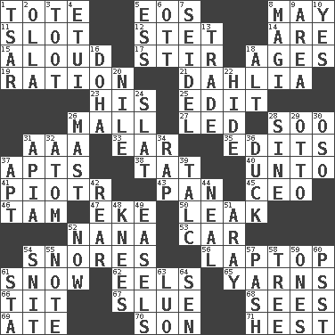 ACROSS 1. Haul 5. Greek goddess of the dawn 8. Can I? 11. Position in a hierarchy or organization 12. Proofreading order 14. "We ___ not amused" (Victoria) 15. Verbally 17. Use a swizzle stick 18. Eras 19. Food allowance for one day 21. A pale violet or amethyst color 23. Part of HMS, perhaps 25. Prepare for publication 26. Shopping center 27. Directed 28. "Barney Miller" actor Jack 31. American Automobile Association (abbr.) 33. Hearing organ 35. Proofreads 37. Tenement units (abbr.) 38. Make lace 40. To (old English) 41. Peter (Polish) 43. Baking dish 45. Corporate head (abbr.) 46. Scottish cap 47. Supplement with great effort 50. Path through which fluid escapes 52. Grandmother 53. Automobile 54. Sounds asleep 56. Portable computer 61. Overwhelm 62. Snakelike fish 65. Entertaining tales 66. Teat (slang) 67. Change direction abruptly 68. Perceives with the eye 69. Had dinner 70. Manchild 71. Command DOWN 1. Russian ruler of old 2. Water jar 3. A blast of a horn 4. Needle case 5. Double-curved letter 6. Baseball player Mel 7. Beer mug 8. Wise men 9. Type of rug 10. Consenting reply 13. Exchange 16. Capital of the state of Qatar 18. The first octave above the treble staff 20. Mediterranean tributary 22. Flintstone garb 24. Narrow board 26. Vertical spar for supporting sails 28. Trig term 29. Von Bismarck 30. Bear (Spanish) 31. Capital of Western Samoa 32. Smallest unit of an element 34. Hit sharply and swiftly 36. Evade 37. Fitting 39. Baby powder 42. Tail end 44. Actress Patricia 48. Leg joints 49. Artist's stands 51. Like ___ of sunshine 52. At this time 54. In a ____ (agitated or irritated) 55. Observe 57. Romantic infatuation 58. Relationship diagram 59. Washington bills 60. Inconspicuous attention getter 61. R.R. building 63. Nilotic language 64. Elected rep.