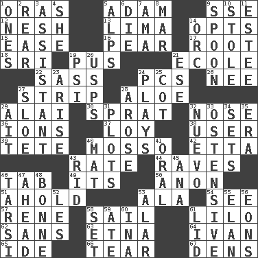 ACROSS 1. Mouths or openings 5. First man 9. Compass dir. 12. Tender 13. Pale green bean 14. Chooses 15. Relaxation 16. Lightbulb-shaped fruit 17. Carrot, for example 18. _ Lanka 19. Product of festering 21. Learning spot: Fr. 22. Backtalk 24. Personal Computers (abbr.) 26. Born 27. Empty completely 28. Medicinal plant 29. Mountain range southwest of Kyrgyzstan 30. Small fatty European fish 32. Sense of smell 36. Charged particles 37. Myrna of the movies 38. One who uses or employs something 39. False hair 40. With motion or animation 42. Singer James 43. Pace 44. All-night dance parties 46. Keyboard key 49. It is 50. At once, immediately (arch.) 51. Hold, grip (Informal) 53. In the manner of 54. Perceive with the eye 57. French philosopher Descartes 58. Move on water 61. _ and Stitch 62. Without 63. Inactive volcano in Sicily 64. _ the terrible 65. Binary compound 66. Pull into pieces 67. Hiding places for outlaws DOWN 1. Washington bills 2. Stern 3. Aide 4. A female animal or person 5. High mountains 6. Expire 7. Nursemaid (var.) 8. Make imperfect 9. Soup utensil 10. Fur scarf 11. First name in cosmetics 14. The grampus (Milton) 19. Air pressure measure (abbr.) 20. United States Postal Service (abbr.) 21. Compass dir. 23. Ascend 24. Live dramatic performances 25. Small bed 27. A type of plum 28. Came up 29. Small island 31. Small pieces of grounds 32. New (sp.) 33. Clearly or manifestly demonstrative 34. Arranges properly for use 35. Period 40. Floor protector 41. Taken by mouth 43. To free from 45. Santa ___, CA 46. Tarsus (plural) 47. At or in the front 48. Maid-servant 52. French article 53. Having or resembling wings 55. Style 56. Immeasurably long periods of time 58. Arrange properly for use 59. Had dinner 60. _ tizzy (2 wds.) 61. Flaplike covering