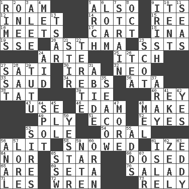 ACROSS 1. Wander 5. In addition 9. ___ a Wonderful Life 12. An arm off of a larger body of water 14. College mil. group 15. To riddle 16. Confronts 17. Haul 18. _ tizzy (2 wds.) 19. Compass dir. 20. Respiratory problem 23. Fast planes 24. Johnson of "Laugh-In" 25. Hankering 27. Suttee (variant) 30. Retirement account (abbr.) 32. Modern: prefix 33. Saudi Arabian king (1953-1964) 34. Confederate soldiers (slang) 36. _ moment's notice (2 wds.) 38. Make lace 39. Make a knot 40. Marina Del _, California 43. Purpose 46. Dutch treat 48. Create 49. Apply oneself diligently 51. Environmental prefix 52. Snake ____ (dice throw) 53. Not divided or shared with others 54. Taken by mouth 56. Came down and settled, as after flight 58. Overwhelmed 61. Ending with capital 64. Not either 65. Play the lead 66. Administered medicine 68. "We ___ not amused" (Victoria) 69. Bristle 70. First course 71. French article 72. Songbird 73. Have confidence or faith in DOWN 1. Basketball hoops 2. Washington bills 3. Toward shelter 4. Was introduced to 5. Bowlike part 6. Rich soil 7. Put through a sieve 8. Sep. follower 9. From or relating to Ireland 10. Portable shelter 11. Oceans 13. Russian ruler of old 21. Disorderly outburst 22. Cigar-shaped 23. Highlander 24. Assist 26. Afternoon social gathering 27. Fast jet (abbr.) 28. American Automobile Association (abbr.) 29. Ballerina skirt 31. Remain 35. Manatee 37. Like ___ of sunshine 41. Make supply last 42. It is so 44. Blemish 45. Pipe bend 47. Greater amount 48. Cartoonist voice _ Blanc 50. Last past 53. Begets 55. Does sums 56. Of or related to the anus 57. Old wives' tales, e.g. 59. Nathan's nickname 60. Northwest Algerian city 61. Capri or Wight 62. Ardor 63. Whirlpool 65. Compass dir. 67. Boat paddle