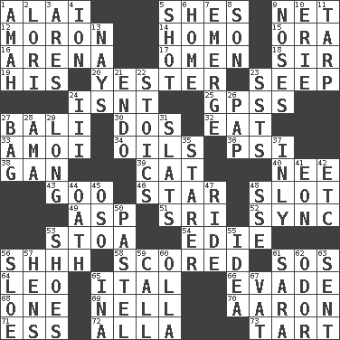 ACROSS 1. Mountain range southwest of Kyrgyzstan 5. "______ My Girl" (Turtles hit) 9. Remaining after all deductions 12. Person of subnormal intelligence 14. Same (prefix) 15. Mouth or opening 16. Sports stadium 17. Sign of things to come 18. Title for a knight 19. Part of HMS, perhaps 20. Next before 23. Ooze 24. Is not 25. Global Positioning Systems (abbr.) 27. Indonesian resort city 30. Two (Sp.) 32. Ingest 33. Mine, in Marseilles 34. Lubricates 36. Air pressure measure (abbr.) 38. Separate the seeds from cotton 39. Feline 40. Born 43. Thick or sticky substance 46. Play the lead 48. Position in a hierarchy or organization 49. Viper 51. Indian title of respect (Mr.) 52. Synchronize (abbr.) 53. Portico 54. Singer Brickell 56. Quiet! 58. Tallied 61. Distress signal 64. Lion 65. Slanted text style (abbr.) 66. Elude 68. Single 69. 1994 drama film starring Jodie Foster 70. Composer Copland 71. Curvy letter 72. Silent film actress Nazimova 73. Small pie DOWN 1. Housemaid 2. Australian parrot (variant) 3. Ancient Greek god of war 4. Electrically charged atom 5. Guess 6. Dwelling 7. Develop 8. Male offspring 9. Olfactory organs 10. 4th largest of the Great Lakes 11. Canvas cover 13. Negative votes 21. Inside; within (prefix) 22. Unemotional ones 23. Fast planes 24. One more than two 26. Infant food 27. Paper or plastic container 28. Nanny (var.) 29. Having great length 31. Narrow boards 35. A viewer who gazes fixedly 37. In an inward manner 41. A really long time 42. And so on (abbr.) 44. Pledge 45. Bear (Spanish) 47. Travel on or in a vehicle 48. Compass dir. 50. Soft color 53. Imelda's hoard 55. It may be bright or harebrained 56. A type of plum 57. Coop moms 59. Give a ring to 60. Spanish pot 61. "Two Mules for Sister ____" 62. Scent 63. Emitted 65. _ tizzy (2 wds.) 67. Large container