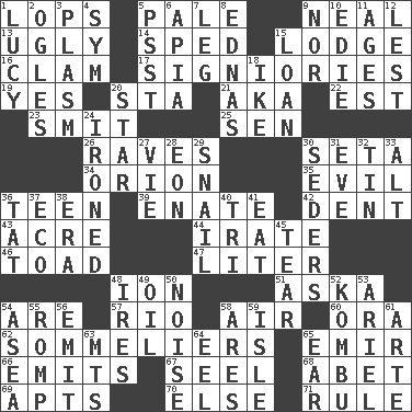 ACROSS 1. Chops off 5. Light colored 9. Actress Patricia 13. Unsightly 14. Hurried 15. Cabin 16. Burrowing marine mollusk 17. Seigniories (variant) 19. Affirmative reply 20. R.R. building 21. Alias (abbr.) 22. Eastern Standard Time (abbr.) 23. Stricken, poetically 25. Elected rep. 26. All-night dance parties 30. Stalk of a moss capsule 34. Constellation of myth 35. Morally bad or wrong 36. Adolescent 39. Maternal 42. Undesirable depression on a surface 43. Measure of real estate 44. Feeling or showing extreme anger 46. Frog relative 47. 61 cubic inches 48. Electrically charged atom 51. "____ silly question..." 54. "We ___ not amused" (Victoria) 57. River (Sp.) 58. Wind 60. Mouth or opening 62. Wine waiters 65. Arab leader 66. Sends forth 67. Stitch closed the eyes of (a falcon) 68. Collude with 69. Flats, for short 70. Otherwise 71. General guideline DOWN 1. "I Love _" 2. Stares at amorously 3. Suffix with ecto or cyto 4. Symbol (abbr.) 5. Inconspicuous attention getter 6. Capital of Western Samoa 7. Part of a journey 8. Ferber et al. 9. Not either 10. Singer Brickell 11. Eras 12. For fear that 15. Grant temporary use of 18. Eisenhower's nickname 20. Play the lead 24. Pressed 27. Compete 28. Period of immesurable duration 29. Slow-paced one 30. Spring feasts 31. First lady 32. Metal container 33. The first octave above the treble staff 36. Make lace 37. Environmental prefix 38. Period 40. Three (prefix) 41. Consume 45. Lacerate 48. Angers 49. Petroleum 50. Annoying sound 52. Dried seaweed eaten as food 53. Satellite of Uranus 54. Toward the sea 55. Frolic 56. Send forth 58. Ancient Greek god of war 59. Small island 61. Johnson of "Laugh-In" 63. Mountains (abbr.) 64. Snakelike fish 65. Ewer handle