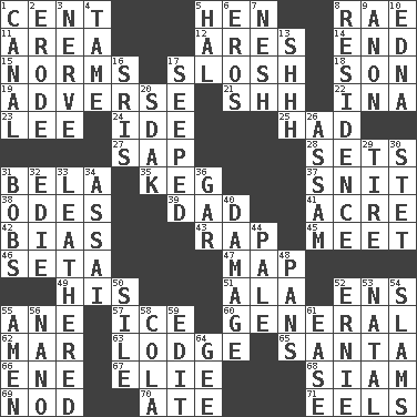 ACROSS 1. Penny 5. Layer 8. Actress Charlotte 11. Length times width 12. Ancient Greek god of war 14. Conclusion 15. Typical models 17. Make a splashing sound 18. Boy, to dad 19. Contrary to your interests or welfare 21. Quiet! 22. _ tizzy (2 wds.) 23. Area sheltered from the wind 24. Binary compound 25. Possessed 27. Plant excrement 28. Arranges properly for use 31. Actor Lugosi 35. Barrel 37. In a ____ (agitated or irritated) 38. Lyric poems 39. Male parent 41. 1/640 square mile 42. Prejudice 43. Hit sharply and swiftly 45. Rendezvous 46. Stalk of a moss capsule 47. Atlas unit 49. Part of HMS, perhaps 51. Wing 52. Followers of ems 55. A saturated hydrocarbon 57. Frozen water 60. Commissioned military rank 62. Spoil 63. Inn 65. Before Barbara or Clara 66. Compass dir. 67. Writer Wiesel 68. Thailand, formerly 69. Dreamland 70. Had dinner 71. Snakelike fish DOWN 1. Lessep's creation 2. Wear away 3. Boldness 4. Docile 5. Actor Linden 6. Greek god of love 7. Delicate 8. Dwelling 9. At once, immediately (arch.) 10. Pulitzer Prize-winning author Ferber 13. Quiet! 16. Indian titles of respect 17. Oozed 20. Neighbor of Neb. 26. Indian state 29. Become fatigued 30. Proofreading order 31. Moves up and down 32. Singer Brickell 33. Resembling or made to resemble leather 34. Slender Brazilian palm 36. Slender fish 40. Break 44. Diluted with white 48. Zero-star reviews 50. Drop; flow; fall 52. Bert's buddy 53. Relating to or accompanying birth 54. Criticizes harshly 55. So be it 56. Billionth: prefix 58. Root beer relative 59. Prepare for publication 61. Comfort 64. Turn to the right