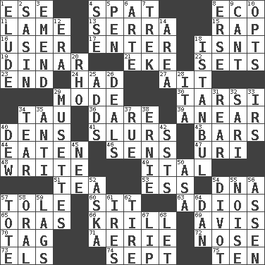 ACROSS 1. Compass dir. 4. Petty quarrel 8. Environmental prefix 11. Unable to walk 13. Father Junipero _ 15. Hit sharply and swiftly 16. One who makes use of a thing 17. Keyboard key 18. Is not 19. Middle Eastern gold or silver currency 21. Supplement with great effort 22. Puts into a specified state 23. Conclusion 24. Possessed 27. Small island 29. Method 30. Tarsus (plural) 34. The 19th letter of the Greek alphabet 36. Have the gumption 39. Approach 40. Cub Scout units 41. Plays smoothly or legato 43. Long, evenly shaped pieces 44. Eroded 46. Elected reps. 47. RI univ. 48. Compose 49. Slanted text style (abbr.) 51. Afternoon social gathering 53. Double-curved letter 54. Heredity factor (abbr.) 57. Lacquered or enameled metalware 60. Be seated 63. Goodbye (Sp.) 65. Mouths or openings 66. The principal food of baleen whales 69. Advice 70. Label 71. Nest on high 72. Sense of smell 73. Raised railways 74. Back-to-school mo. 75. Nine, plus one DOWN 1. Evade 2. Indian antelope 3. Make improvements or corrections to 4. Compass dir. 5. Writing instrument 6. Johnson of "Laugh-In" 7. Long journey 8. Celtic language 9. Patter 10. Chooses 12. Epoch 14. Type of rug 18. Byzantium, centuries later 20. 17th letter of the Greek alphabet 25. Sums up 26. Allots cards 28. Call ___ day 29. French bagpipes 31. Posterior 32. Indian skirt 33. Big collection agency 34. Pull apart 35. Against 37. Regret 38. Bert's buddy 40. Morning condensation 42. Fast planes 45. Born 50. White ___ sheet 52. "____ silly question..." 54. A piece of turf (Scot.) 55. Annoying sound 56. NE Netherlands city 57. Carry 58. Relating to the mouth 59. Falls behind 61. Angers 62. Hoop that covers a wheel 64. One of the 12 tribes of Israel 67. Mouth edge 68. Allow