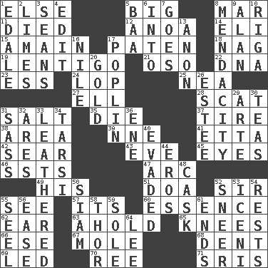ACROSS 1. Otherwise 5. Massive 8. Spoil 11. Passed on 12. Small Philippine buffalo 14. Biblical high priest 15. With great haste 17. Eucharist need 18. Tired old horse 19. Small, flat, pigmented spot on the skin 21. Bear (Spanish) 22. Heredity factor (abbr.) 23. Curvy letter 24. Chop off 25. Teachers' org. 27. Pipe bend 28. Go away! 31. Table seasoning 35. Pass on 37. Become fatigued 38. Type of rug 39. Compass dir. 41. Singer James 42. Singe 43. Night before a holiday 45. Snake ____ (dice throw) 46. Fast planes 47. Curve 49. Part of HMS, perhaps 51. ___ good deed 52. Title for a knight 55. Observe 57. ___ a Wonderful Life 60. Core 62. Ewer handle 63. Hold, grip (Informal) 65. Leg joints 66. Compass dir. 67. Undercover agent 68. Undesirable depression on a surface 69. Directed 70. To riddle 71. Indian titles of respect DOWN 1. Peak District village in England 2. Citrus fruits 3. Actors Connery and Penn 4. Prepare for publication 5. Sound made by sheep 6. To the inside or interior of 7. Leaves 8. Ananias' fault 9. Actor Alda or Thicke 10. Capital of Latvia 13. At once, immediately (arch.) 16. The longest river in the world 17. Cotton for raincoats, e.g. 20. Aureate 26. First name in cosmetics 29. Johnson of "Laugh-In" 30. Beverages made from leaves 31. Backtalk 32. Ancient Greek god of war 33. Tough but pliablecoriaceous 34. Tarsus (plural) 36. Compass dir. 40. Eluded 44. Greek god of love 48. Keg 50. Thailand, formerly 52. Scornful expression 53. Ancient Celtic tribe of eastern Britain 54. Musical pauses 55. Stitch closed the eyes of (a falcon) 56. Relaxation 58. Son of Odin 59. Flatfish 61. Extremities 64. Area sheltered from the wind