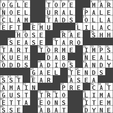 ACROSS 1. Stare 5. Drink excessively 9. Spoil 12. Christmas carol 13. Mountain range 14. Diluted with white 15. Dollar (slang) 16. Small amounts or degrees 17. Rounded earthenware pot or jar 18. Lizard (obsolete) 19. Australian flightless bird 21. Pale purple color 22. Stockings 24. Actress Charlotte 26. Quiet! 27. Gospel singer Marvin 28. Edible starchy tuberous root 29. Small pie 30. Singer Mel 32. Naughty children 36. Malaysian steamed pastry 37. Pat or tap gently 38. Anneal 39. Probability 40. Goodbye (Sp.) 42. "60 Minutes" Commentator Rooney 43. Highlander 44. Watches over 46. Fast jet (abbr.) 49. Hearing organ 50. Toward the sea 51. At full speed 53. Before (prefix) 54. Domesticated feline 57. Abrupt rush of wind 58. Musical group of three 61. Pale green bean 62. Singer James 63. Immeasurably long periods of time 64. Detail 65. Compass dir. 66. Blind as ____ 67. Centimeter-gram-second unit of force DOWN 1. At one time in the past 2. _ course 3. Tough but pliablecoriaceous 4. Shade tree 5. Ballerina skirt 6. Mouth or opening 7. Writing tablet 8. Raised railways 9. Shopping centers 10. Assad's deity 11. Arrive at 14. Luau course 19. Curvy letter 20. Rendezvous 21. Lion 23. Profane or obscene expressions 24. Role for Stallone 25. "We ___ not amused" (Victoria) 27. Saudi Arabian king (1953-1964) 28. Go after with the intent to catch 29. Ring climax 31. More peculiar 32. Empty; void 33. Ananias' fault 34. Groovy apts. 35. Cunning 40. American Automobile Association (abbr.) 41. Play the lead 43. Commissioned military rank (abbr.) 45. Compass dir. 46. Gurus 47. Particles of soot 48. Clothes sense 52. Call ___ day 53. Mail 55. So be it 56. Not wild 58. Afternoon social gathering 59. Director Reiner 60. _ tizzy (2 wds.) 61. Hat (slang)