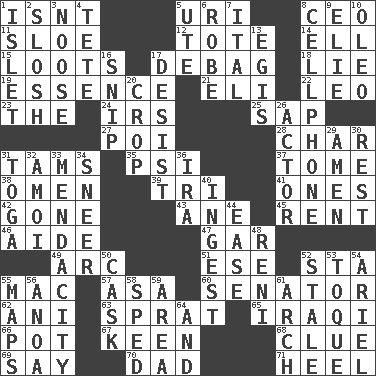 ACROSS 1. Is not 5. RI univ. 8. Corporate head (abbr.) 11. A type of plum 12. Carry 14. Pipe bend 15. Plunders 17. Debunk (Brit. slang) 18. Whopper 19. Substance 21. Biblical high priest 22. Lion 23. Definite Article 24. Big collection agency 25. Plant excrement 27. Luau course 28. Burn to charcoal 31. Scottish caps 35. 23rd letter of the Greek alphabet 37. Heavy book 38. Presage 39. Three (prefix) 41. Washington bills 42. Went 43. One (Scot) 45. Monthly bill 46. Assistant 47. Slender fish 49. Curve 51. Compass dir. 52. R.R. building 55. Apple computer (short form) 57. White ___ sheet 60. Elected representative 62. Black tropical American cuckoo 63. Small fatty European fish 65. Resident of Iraq 66. Cooking vessel 67. Peachy ____! 68. A slight indication 69. Declare 70. Male parent 71. The bottom of a shoe or boot DOWN 1. Small island 2. Agitate, as a liquid 3. Trap for birds or small mammals 4. Wig 5. Shoshoni 6. Loose flowing garment 7. Slanted text style (abbr.) 8. Portable communications device 9. Writer Wiesel 10. Butter sub 13. Armor plate that protects the chest 16. Clip 17. Stop 20. Riding implement 26. Thespian 29. So be it 30. Take ten 31. Ancient Roman robe 32. Mine, in Marseilles 33. Ananias' fault 34. Scornful expression 36. Retirement account (abbr.) 40. Eat 44. Comfort 48. Painter Guido (1575-1642) 50. Keg 52. Showing deterioration from age 53. Woman's close-fitting hat 54. Satellite of Uranus 55. Atlas contents 56. Small Philippine buffalo 58. Broke a traffic law 59. Type of rug 61. Bowlike part 64. Plus