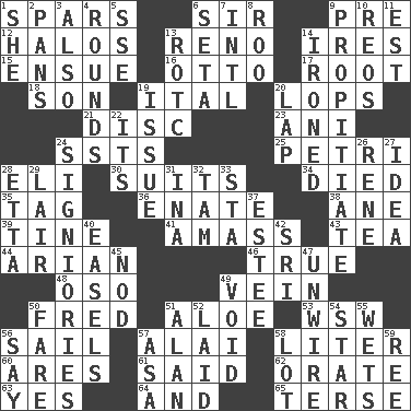 ACROSS 1. Practice fights 6. Title for a knight 9. Before (prefix) 12. Saint headwear 13. Former U.S. Attorney General Janet 14. Angers 15. Take place subsequently 16. Von Bismarck 17. Carrot, for example 18. Boy, to dad 19. Slanted text style (abbr.) 20. Chops off 21. Compact _ 23. Black tropical American cuckoo 24. Fast planes 25. _ dish (used to culture cells) 28. Biblical high priest 30. Sets or collections 34. Passed on 35. Label 36. Related on the mother's side 38. One (Scot) 39. Prong on a fork 41. Collect or gather 43. Beverage made from leaves 44. Believer in; advocate of (suffix) 46. Loyal 48. Bear (Spanish) 49. Distinctive style or manner 50. Flintstone 51. Medicinal plant 53. Compass dir. 56. Move on water 57. Jai _ 58. 61 cubic inches 60. Ancient Greek god of war 61. Expressed in words 62. Speak pompously 63. Consenting reply 64. Added to 65. Laconic DOWN 1. A female animal or person 2. Baking dishes 3. In addition 4. Periods in a boxing match 5. Compass dir. 6. Bristle 7. International (abbr.) 8. Friend of Pooh 9. Appease 10. Vintage cars 11. Eastern Standard Time (abbr.) 13. College mil. group 14. Pressed 19. Come out of 20. Infant locale 22. ___ a Wonderful Life 24. Seigniories (variant) 26. French philosopher Descartes 27. The main thing one is thinking about 28. Singer James 29. Den 31. _ tizzy (2 wds.) 32. Scottish cap 33. R.R. building 37. First name in cosmetics 40. Artist's stands 42. _ Lanka 45. Lower and raise head in agreement 47. Undo the wiring of 49. Null 50. Conductor's collection 51. Actor Alda or Thicke 52. Put down 54. Play the lead 55. Soaks 56. Declare 57. White ___ sheet 58. Car dealer's back yard 59. To riddle