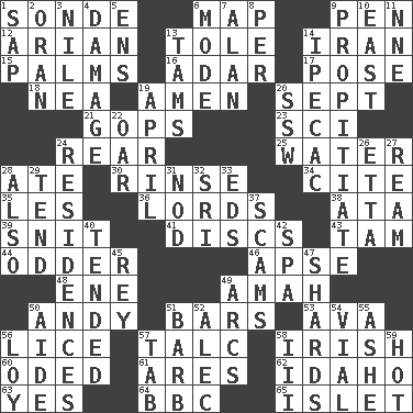 ACROSS 1. Something which is sent 6. Atlas unit 9. Fenced enclosure 12. Believer in; advocate of (suffix) 13. Lacquered or enameled metalware 14. SW Asia republic 15. Insides of hands 16. The sixth month of the Jewish calendar 17. Airs 18. Teachers' org. 19. So be it 20. Back-to-school mo. 21. Republicans 23. _-fi 24. Posterior 25. Wetness 28. Had dinner 30. Remove soap 34. Quote 35. French article 36. Domineers 38. "One Day ___ Time" 39. In a ____ (agitated or irritated) 41. Plates 43. Scottish cap 44. More peculiar 46. Domed church section 48. Compass dir. 49. Nanny 50. Actor Griffith 51. Oblong pieces of solid material 53. Actress Gardner 56. Louse (plural) 57. Baby powder 58. From or relating to Ireland 60. Wrote a lyric poem 61. Ancient Greek god of war 62. Potato state 63. Consenting reply 64. English channel? 65. Small island DOWN 1. Plant excrement 2. Northwest Algerian city 3. Mediterranean tributary 4. Break 5. Followers of ems 6. Method 7. Actor Alda or Thicke 8. For each 9. Appease 10. Compass direction 11. Compass dir. 13. Scottish caps 14. Medicinal drug used to evoke vomiting 19. Showery time 20. Compass dir. 22. Rowing implement 24. Dwellings 26. Singer James 27. 480, 500 or 516 sheets of paper 28. In addition 29. Watch over 31. Dreamland 32. _ Lanka 33. Begley and Asner 37. Fraudulent business schemes 40. Watched over 42. Health resort 45. Marina Del _, California 47. Broken pieces 49. Arches 50. Helper 51. Sharp remark 52. Actor Baldwin 54. Small bottle 55. American tennis player Robert 56. Myrna of the movies 57. Bar bill 58. One more than two 59. Being at a high temperature