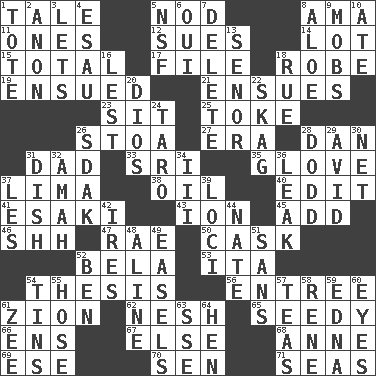ACROSS 1. Story 5. Dreamland 8. Wet nurse (var.) 11. Singles 12. Institutes legal proceedings 14. Car dealer's back yard 15. "_____ Recall" 17. Do some clerical work 18. Loose flowing garment 19. Followed as a consequence or result 21. Follows as a consequence or result 23. Be seated 25. Casino tip 26. Portico 27. Epoch 28. Daniel's nick name 31. Male parent 33. Indian title of respect (Mr.) 35. Michael Jackson trademark 37. Pale green bean 38. Petroleum 40. Prepare for publication 41. 1973 Nobel Price Winner (Physics) Leo 43. Electrically charged atom 45. Say or write further 46. Quiet! 47. Actress Charlotte 50. Keg 52. Actor Lugosi 53. Call ___ day 54. College paper 56. Main course 61. The Jewish people; Israel 62. Soft 65. Morally degraded 66. Followers of ems 67. Otherwise 68. Queen of England 1702-14 69. Compass dir. 70. Elected rep. 71. Oceans DOWN 1. Carryall 2. At once, immediately (arch.) 3. Allows 4. He sold his birthright 5. Overdraft (abbr.) 6. Fr. "Yes" 7. Erase 8. Medicinal plant 9. Crowds into 10. Had dinner 13. Sir (Sp.) 16. For fear that 18. Regret 20. "Vaya con ____" 22. Heroin 24. Edible starchy tuberous root 26. Neighbor of Neb. 28. Texas town _ City 29. Enthusiastic 30. Fish or hair follower 31. Food container 32. Wet nurse 34. One more than two 36. Path through which fluid escapes 37. French article 39. Locales 42. Angers 44. Nathan's nickname 48. Place in a line 49. Artist's stands 51. Without 52. Benjamin's nick name 54. Canisters 55. Stockings 57. Beverages made from leaves 58. French philosopher Descartes 59. Pulitzer Prize-winning author Ferber 60. Snake ____ (dice throw) 61. Last letter of the English alphabet 63. Compass dir. 64. Layer