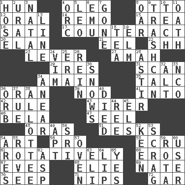 ACROSS 1. Attila the _ 4. Cassini of fashion 8. "Beetle Bailey" pooch 12. Relating to the mouth 14. San ____ (Riviera town) 15. Length times width 16. Suttee (variant) 17. Frustrate 20. Flair 21. Snakelike fish 22. Quiet! 23. Prying instrument 27. Wet nurse 29. Angers 31. Examine minutely or intensely 34. At full speed 35. Baby powder 36. NW Algerian seaport 39. Dreamland 41. To the inside or interior of 42. Governing power 43. One who wires 46. Actor Lugosi 47. Sew up the eyelids of hawks and falcons 48. Mouths or openings 51. Writing tables 54. Tate display 56. Adept person 58. Shade of tan 61. Rotating or pertaining to rotation 66. Greek god of love 67. Nights before holidays 68. Writer Wiesel 69. Nathan's nickname 70. Ooze 71. Cuts off 72. Slender fish DOWN 1. Stockings 2. Mountain range 3. Brizilian seaport 4. The grampus (Milton) 5. Lion 6. Australian flightless bird 7. Went 8. Rowing implement 9. File 13 10. Technical work 11. Pledge 13. Actor's bit 18. Beverage made from leaves 19. Shade tree 24. Zeal 25. Epoch 26. It's straight from the horse's mouth 28. Moving or stirring 30. Overwhelms 32. Keyboard modifier key 33. Non-commissioned officer (abbr.) 34. Approach 36. Globe 37. Regret 38. One to whom something is allotted 40. Passed on 44. To riddle 45. Raised railways 49. Fitting 50. _ Lanka 52. Peachy ____! 53. Strangle with an iron collar 54. Ancient Greek god of war 55. Be footloose 57. Baking chamber 59. Round or rotation of duties 60. One who uses or employs something 62. Cleo's killer 63. Connecticut Ivy Leaguer 64. Mouth edge 65. It is so