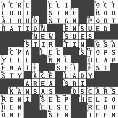ACROSS 1. 43,560 square feet 5. Connecticut Ivy Leaguer 8. Sep. follower 11. Plunder 12. Trig term 14. Sometimes accompanies a hiss 15. Verbally 17. Omen 18. Sweet dark-red dessert wine 19. Food allowance for one day 21. Followed as a consequence or result 23. ___ Haven, CT 25. Takes to court 26. Commotion 27. Shallow baking pan 28. Girls' org. (abbr.) 31. Numbers guy (abbr.) 33. Area sheltered from the wind 35. Halts 37. Shout 38. Compass dir. 40. Pile 41. Maternal 43. Put into a specified state 45. Eastern Standard Time (abbr.) 46. Filthy place 47. Adept person 50. Kenny Rogers chart-topper in '80 52. Type of rug 53. _ Lanka 54. Sunflower state 56. Motion picture awards 61. Painter Guido (1575-1642) 62. Ooze 65. Sun: prefix 66. Layer 67. Otherwise 68. Redecorate 69. Single 70. Elected rep. 71. Adolescent DOWN 1. Having or resembling wings 2. Root beer relative 3. Carrot, for example 4. Needle holder 5. Double-curved letter 6. Cards in a Roman deck? 7. Eat 8. Mitch Miller's instrument 9. Drawstring 10. Small child 13. World-weariness 16. Do not 18. Fluid product of inflammation 20. Famous astronaut Armstrong 22. Elected reps. 24. Songbird 26. Table seasoning 28. Leaves 29. Argument over a trivial matter 30. Cleo's killer 31. Penny 32. Frolic 34. Followers of ems 36. Those things 37. It is so 39. Snakelike fish 42. Hearing organs 44. Pacific island yam 48. Stop 49. Artist's stands 51. Food container 52. Cuckoo 54. Peachy ____! 55. Queen of England 1702-14 57. Foregone conclusion 58. Toward shelter 59. Travel on or in a vehicle 60. Within a short period 61. 17th letter of the Greek alphabet 63. Compass dir. 64. Animal enclosure