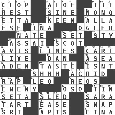 ACROSS 1. Hoof sound 5. _ vera 9. Teat (slang) 12. Relief 13. Trig term 14. Words to Nanette 15. Singer James 16. Peachy ____! 17. Silent film actress Nazimova 18. Compass dir. 19. _ tizzy (2 wds.) 21. Stared 22. Nathan's nickname 24. Arrange properly for use 26. Filthy place 27. Slender Brazilian palm 28. Highlander 29. Advice 30. Citrus fruits 32. Heavy open wagon 36. Moving, as bait 37. One of the 12 tribes of Israel 38. Toward the sea 39. An important port of Yemen 40. Clothes sense 42. Is not 43. Quiet! 44. Bitter 46. Strike 49. Lion 50. Vintage cars 51. Foe 53. Bear (Spanish) 54. Metal container 57. Stalk of a moss capsule 58. Downhill vehicle 61. "Two Mules for Sister ____" 62. Small pie 63. Comfort 64. Fastener 65. _ Lanka 66. Flats, for short 67. Inactive volcano in Sicily DOWN 1. Algonquian 2. Allows 3. Clearly or manifestly demonstrative 4. Parent Teacher Assoc. 5. "____ silly question..." 6. Untruth 7. Single 8. Car or cant ending 9. For Whom the Bell _____ 10. An arm off of a larger body of water 11. Sycophant 14. Tired old horse 19. Call ___ day 20. Famous astronaut Armstrong 21. Baseball player Mel 23. NE Netherlands city 24. Aroma 25. Greek goddess of the dawn 27. Enthusiastic 28. Box-office sellout 29. Chicken ___ king 31. Potato state 32. Capital of Egypt 33. Aide 34. Tear apart 35. Make lace 40. Definite Article 41. Hearing organs 43. Roguish 45. Corporate head (abbr.) 46. Musical pauses 47. Approach 48. _ dish (used to culture cells) 52. Floor protector 53. Lyric poems 55. SW Asia republic 56. California wine valley 58. Ocean 59. Pet locale 60. Eastern Standard Time (abbr.) 61. Compass dir.