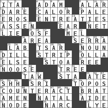 ACROSS 1. Call ___ day 4. First of billions? 8. Having or resembling wings 12. Have the gumption 14. Bodily heat indicating an inflammation 16. Diluted with white 17. Greek god of love 18. Pleas 20. NE Netherlands city 22. Hearing organ 23. Remaining after all deductions 24. Untruth 25. Order of Saint Francis (abbr.) 28. Cartoonist voice _ Blanc 30. Length times width 31. Spanish missionary in California 35. Experiment locale 37. Russian ruler of old 40. Part of speech 41. Deli pickle 42. Empty completely 44. Spanish pot 45. Otherwise 46. Portico 47. To separate or throw off 48. Trap for birds or small mammals 50. Woody plant 52. The 23rd letter of the Hebrew alphabet 54. R.R. building 55. Had dinner 58. Quiet! 61. _ Lanka 63. Literary convention 65. Act in opposition 70. Naughty child 71. So be it 72. Relating to or accompanying birth 73. Assistant 74. Thickened enlargement 75. Drug cop 76. Sodium hydroxide DOWN 1. Standard of perfection 2. Tarsus (plural) 3. Came up 4. Adept person 5. Daniel's nick name 6. The first octave above the treble staff 7. Greater amount 8. Fitting 9. (Had) reclined 10. Toward shelter 11. Respite 13. Compass dir. 15. 480, 500 or 516 sheets of paper 19. Ancient Greek god of war 21. And not 26. Puts into a specified state 27. Goes without food and/or water 29. Poe poem 30. Most capable 32. Hero or heavy, e.g. 33. Governing power 34. Santa ___, CA 35. _ and Stitch 36. In addition 38. Nonscientific branch of learning 39. Disturbances 41. Lair 43. Role in a play 49. 90 degrees 51. Ingest 53. Songbird 55. Showery time 56. Sycophant 57. First name in cosmetics 58. Glance over 59. Same (prefix) 60. Took on color 62. SW Asia republic 64. Chief or king in Benin or Nigeria 66. Compass dir. 67. "One Day ___ Time" 68. Automobile 69. Affectionate concern, for short