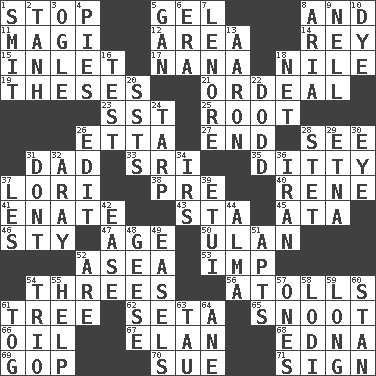 ACROSS 1. Constrict 5. Set 8. Added to 11. Wise men 12. Type of rug 14. Marina Del _, California 15. An arm off of a larger body of water 17. Grandmother 18. The longest river in the world 19. College papers 21. Severe or trying experience 23. Fast jet (abbr.) 25. Carrot, for example 26. Singer James 27. Conclusion 28. Observe 31. June honoree 33. _ Lanka 35. Simple song 37. Australian parrot (variant) 38. Before (prefix) 40. French philosopher Descartes 41. Maternal 43. R.R. building 45. _ moment's notice (2 wds.) 46. Filthy place 47. Grow older 50. Uhlan (variant) 52. Toward the sea 53. Naughty child 54. Triads 56. Ringlike coral islands and reefs 61. Relationship diagram 62. Bristle 65. Snob 66. Lubricate 67. Style 68. Pulitzer Prize-winning author Ferber 69. Grand Old Party 70. Institute legal proceedings 71. Public display of a written message DOWN 1. Stricken, poetically 2. Hyperbolic tangent 3. Stare 4. Sliced desserts 5. Separate the seeds from cotton 6. Period 7. Poe poem 8. Operatic vocal solo 9. 1994 drama film starring Jodie Foster 10. Color 13. Composer Copland 16. Trial 18. Remaining after all deductions 20. Fast planes 22. Texas town _ City 24. Canvas cover 26. Prepare for publication 28. Proofreading order 29. Inactive volcano in Sicily 30. Sight organ 31. Do not 32. Like ___ of sunshine 34. Big collection agency 36. SW Asia republic 37. French article 39. Needle case 42. Comfort 44. _ mater 48. Honkers 49. Artist's stands 51. Flats, for short 52. "We ___ not amused" (Victoria) 54. Musical group of three 55. Aid 57. Washington bills 58. Farming town in central California 59. Having great length 60. Comedian Laurel of Laurel & Hardy 61. Coat; cloak 63. The 19th letter of the Greek alphabet 64. One (Scot)