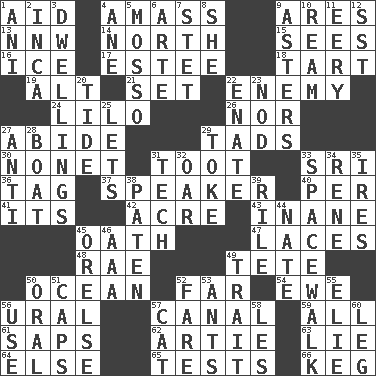ACROSS 1. Help 4. Collect or gather 9. Ancient Greek god of war 13. Compass dir. 14. _ pole 15. Observes 16. Frozen water 17. First name in cosmetics 18. Small pie 19. Keyboard modifier key 21. Put into a specified state 22. Foe 24. _ and Stitch 26. And not 27. Remain 29. Small boys 30. Music written for nine 31. A blast of a horn 33. Indian title of respect (Mr.) 36. Label 37. Orator 40. For each 41. ___ a Wonderful Life 42. Measure of real estate 43. Lacking in sense or substance 45. Pledge 47. Shoestrings 48. Actress Charlotte 49. Wig 50. Sea 52. At a great distance 54. She-sheep 56. Mountain range 57. Lessep's creation 59. 100% 61. Plant excrements 62. Nick name for Arthur 63. Untruth 64. Otherwise 65. Trials 66. Cask DOWN 1. Black tropical American cuckoo 2. South American Indian 3. Residences 4. One (Scot) 5. With motion or animation 6. Johnson of "Laugh-In" 7. Proofreading order 8. A female animal or person 9. Michaelmas daisies 10. 480, 500 or 516 sheets of paper 11. Suggestive of the supernatural 12. Fast jet (abbr.) 20. Event that recurs at intervals 22. Related on the mother's side 23. Dreamland 25. Allows 27. Opposed to 28. Water vessel 29. Casino tip 31. Technical work 32. Rowing implement 33. High altitude stroll 34. French philosopher Descartes 35. Angers 38. Eucharist need 39. Cause heat under the collar 44. Nathan's nickname 45. Threatening words 46. Auto club (abbr.) 49. Distinguishing feature 50. Of the mouth 51. Balmoral and tarboosh 52. Conductor's collection 53. Pismires 55. Writer Wiesel 56. Purpose 57. Domesticated feline 58. French article 60. Part of a journey