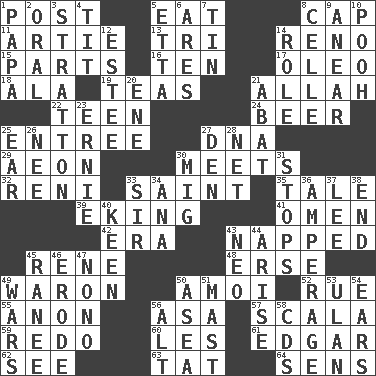 ACROSS 1. Mail 5. Consume 8. Head covering 11. Nick name for Arthur 13. Three (prefix) 14. Western Nevada city 15. Actors' quests 16. Nine, plus one 17. Margarine 18. Insect wing 19. Beverages made from leaves 21. Assad's deity 22. Adolescent 24. Fermented drink made from hops 25. Main course 27. Heredity factor (abbr.) 29. A really long time 30. Confronts 32. Painter Guido (1575-1642) 33. Inhabitant of Heaven 35. Falsehood 39. Supplementing with great effort 41. Sign of something about to happen 42. Period 43. Slept 45. French philosopher Descartes 48. Celtic language 49. Make _____ (do battle with) 50. Mine, in Marseilles 52. Sorrow 55. At once, immediately (arch.) 56. White ___ sheet 57. Any of the three canals of the cochlea 59. Make new 60. French article 61. _ Allan Poe 62. Perceive with the eye 63. Make lace 64. Elected reps. DOWN 1. Dad 2. Relating to the mouth 3. Ski resort town in Vermont 4. Teat (slang) 5. Singer James 6. Ancient Greek god of war 7. Shallow baking pan 8. Cell (Danish) 9. Approach 10. "Silly old bear" 12. First name in cosmetics 14. Hero or heavy, e.g. 20. Compass dir. 21. Blind as ____ 23. Bert's buddy 25. Ewer handle 26. Born 27. Lair 28. Fish or hair follower 30. Russian fighter aircraft 31. Halts 33. Title for a knight 34. Santa ___, CA 36. Electrical Measurement 37. Area sheltered from the wind 38. Conclude 40. Peachy ____! 43. Modern: prefix 44. Originate 45. The wife of a rajah (variant) 46. Eat (away) 47. Words to Nanette 49. Armed conflicts 50. Toward the sea 51. Vertical spar for supporting sails 53. ____ Bator 54. Hearing organs 56. Keyboard modifier key 58. Music discs