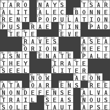 ACROSS 1. Edible starchy tuberous root 5. Negative votes 9. Russian ruler of old 13. Set down 14. Actor Baldwin 15. Child's nurse 16. Monthly bill 17. Census information 19. Fluid product of inflammation 20. Actress Charlotte 21. Shallow baking pan 22. Writing tablet 23. Wig 25. Night before a holiday 26. All-night dance parties 30. Toward the sea 34. Constellation of myth 35. Confront 36. Is not 39. Related on the mother's side 42. Diluted with white 43. Those things 44. Feeling or showing extreme anger 46. Stitch closed the eyes of (a falcon) 47. 61 cubic inches 48. Immediately 51. A really long time 54. _ moment's notice (2 wds.) 57. Boat paddle 58. Followers of ems 60. To sift 62. Unrelated to defense, as in spending 65. Inventor's middle name 66. Lag or linger behind 67. Oceans 68. Horse sense 69. Not divided or shared with others 70. Drawn tight 71. Domed church section DOWN 1. Canvas cover 2. Native American of Southwest Alaska 3. Remove soap 4. Baseball player Mel 5. California wine valley 6. Medicinal plant 7. Slangy assent 8. Turtle shell scale 9. Small child 10. Clip 11. Small Philippine buffalo 12. Tear apart 15. Object of repulsion 18. 54 in ancient Rome 20. Located in or toward the back 24. Trinitrotoluene 27. Compete 28. Period of immesurable duration 29. Slow-paced one 30. Electrical Unit 31. Ocean 32. Snakelike fish 33. Had dinner 36. It is 37. A female animal or person 38. Born 40. Three (prefix) 41. Ingest 45. Beverages made from leaves 48. Christmas carol 49. Clumsy lout 50. Obtain by seizing forcibly or violently 52. Fourth or lowest deck 53. Congenital growth or mark on the skin 54. Pismires 55. "Corrida" creature 56. Of or related to the anus 58. Son of Isaac 59. A home for chicks 61. Comfort 63. Expire 64. Teachers' org. 65. Santa ___, CA