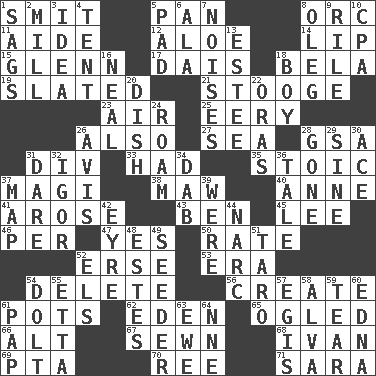 ACROSS 1. Stricken, poetically 5. Baking dish 8. The grampus (Milton) 11. Assistant 12. _ vera 14. Mouth edge 15. American astronaut and politician John 17. Raised platform 18. Actor Lugosi 19. Scheduled 21. Moe Howard, for one 23. Wind 25. Suggestive of the supernatural 26. In addition 27. Ocean 28. Girls' org. (abbr.) 31. HTML Container Element 33. Possessed 35. Unemotional 37. Wise men 38. Informal term for the mouth 40. Queen of England 1702-14 41. Came up 43. Benjamin's nick name 45. Area sheltered from the wind 46. For each 47. It is so 50. Assign a rank or rating to 52. Celtic language 53. Period 54. Erase 56. Make 61. Plant holders 62. Genesis locale 65. Stared 66. The first octave above the treble staff 67. Stitched 68. _ the terrible 69. Parent Teacher Assoc. 70. Portuguese money of account (variant) 71. "Two Mules for Sister ____" DOWN 1. Droops 2. Place where flour is made 3. The main thing one is thinking about 4. Portable shelter 5. Writing tablet 6. Wing 7. Annoying sounds 8. Cassini of fashion 9. Cause heat under the collar 10. Tax preparer (abbr.) 13. First name in cosmetics 16. Anneal 18. Male child 20. Food container 22. Mouths or openings 24. Wander aimlessly 26. Advice 28. Went 29. Trig term 30. Adept person 31. Have the gumption 32. Composer Stravinsky 34. Apply (a substance) by light strokes 36. Story 37. Atlas unit 39. We are 42. Jane of fiction 44. Drug cop 48. _____ Park, CO 49. Sowing specialist 51. Edible starchy tuberous root 52. Raised railways 54. Dunce 55. Singer James 57. Armor plate that protects the chest 58. Inventor's middle name 59. Separate forcefully 60. Pulitzer Prize-winning author Ferber 61. Infant food 63. She-sheep 64. Compass dir.