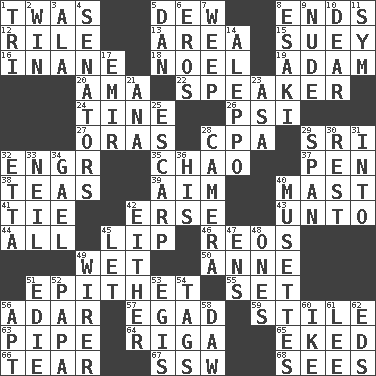 ACROSS 1. It was, poetically 5. Morning condensation 8. Conclusions 12. Cause heat under the collar 13. Length times width 15. Chop _ 16. Silly 18. Christmas carol 19. First of billions? 20. Nanny (var.) 22. Orator 24. Prong on a fork 26. 23rd letter of the Greek alphabet 27. Mouths or openings 28. Accounting whiz (abbr.) 29. _ Lanka 32. Engineer (abbr.) 35. US Secretary of Labor Elaine L. _ 37. Writing instrument 38. Beverages made from leaves 39. Direct toward a target or goal 40. Vertical spar for supporting sails 41. Standoff 42. Celtic language 43. To (old English) 44. 100% 45. Mouth edge 46. Vintage cars 49. Dripping 50. Singer Murray 51. Curse 55. Arrange properly for use 56. The sixth month of the Jewish calendar 57. Mild oath 59. Vertical member of a panel or frame 63. Corncob 64. Capital of Latvia 65. Made supply last 66. Pull into pieces 67. Compass dir. 68. Observes DOWN 1. Three (prefix) 2. Victory 3. Wing 4. Legislators 5. Daniel's nick name 6. Greek god of love 7. Shed a tear 8. 1973 Nobel Price Winner (Physics) Leo 9. Naked 10. Letter starter 11. Symbol (abbr.) 14. City in Syria 17. Arab leader 21. Santa ___, CA 23. White ___ sheet 25. Fortification 28. Device for capturing images 29. Connect, as a bridge 30. Respite 31. To the inside or interior of 32. Singer James 33. Famous astronaut Armstrong 34. Highlander 36. Part of HMS, perhaps 40. French bagpipes 42. One or the other of two 45. Allow 47. Followers of ems 48. Singles 49. One who wires 51. Singer Brickell 52. Dad 53. The front part of a cuirass 54. Labels 56. Fitting 58. Obsolete 60. Mamie's husband 61. Area sheltered from the wind 62. Begley and Asner