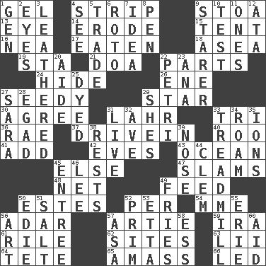 ACROSS 1. Set 4. Empty completely 9. Portico 13. Sight organ 14. Wear away 15. Portable shelter 16. Teachers' org. 17. Consumed 18. At sea 19. R.R. building 21. ___ good deed 22. Actors' quests 24. Flintstone garb 26. Compass dir. 27. Morally degraded 29. Play the lead 30. Match 31. Cowardly lion portrayer 33. Three (prefix) 36. Actress Charlotte 37. Popular '50s hangout 40. Friend of Pooh 41. Find the sum of 42. Nights before holidays 43. Sea 45. Otherwise 47. Criticizes harshly 48. Fish or hair follower 49. Nourish 50. _____ Park, CO 52. For each 54. Madame (abbr.) 56. The sixth month of the Jewish calendar 57. Nick name for Arthur 59. Lyricist Gershwin 61. Cause heat under the collar 62. Settings 63. Cards in a Roman deck? 64. Wig 65. Collect or gather 66. Directed DOWN 1. Commissioned mil. rank 2. Sight organs 3. Resembling or made to resemble leather 4. Observe 5. Buy and sell 6. Printing process, for short 7. The content of cognition 8. Fenced enclosure 9. A viewer who gazes fixedly 10. Trial 11. Singles 12. "One Day ___ Time" 20. Helper 22. _ dish (used to culture cells) 23. Santa ___, CA 25. Colored 27. "Two Mules for Sister ____" 28. Mild oath 29. "______ My Girl" (Turtles hit) 31. Not recorded 32. "___ Maria" 33. Excercise machine 34. Wander aimlessly 35. Charged atoms 38. Musical pauses 39. Characteristic smell of wine 44. Clement's nick name 45. Main course 46. Area sheltered from the wind 49. Strips of potato fried in deep fat 50. Singer Brickell 51. Table seasoning 52. Demure 53. Singer James 55. 4th largest of the Great Lakes 56. Tate display 57. White ___ sheet 58. Curvy letter 60. Help