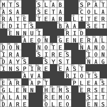 ACROSS 1. Mountains (abbr.) 4. Thick slice 8. Petty quarrel 12. White ___ sheet 13. Stalk of a moss capsule 14. Root beer relative 15. Assign a rank or rating to 17. Separate forcefully 18. 61 cubic inches 19. Prepares for publication 21. Sound made by sheep 23. Arrange properly for use 24. World-weariness 26. To free from 28. A really long time 30. Commissioned military rank 34. Spanish title 37. Short letter 39. Billionth: prefix 40. Lyricist Gershwin 41. Founders of families 43. Electrically charged atom 44. 24-hour periods 46. System (abbr.) 47. Tired old horse 48. Motivate 51. Compass direction 54. Actress Gardner 55. Disturbances 58. Ewer handle 61. Fitting 63. Entreaties 65. American astronaut and politician John 67. Folds over and sews together 71. Celtic language 72. Actor Alda or Thicke 73. San ____ (Riviera town) 74. Be seated 75. Have the gumption 76. Butter sub 77. Followers of ems DOWN 1. Female horse 2. Sadhe (variant) 3. Smooth fabric 4. Fast jet (abbr.) 5. Area sheltered from the wind 6. _ moment's notice (2 wds.) 7. Sharp remark 8. _-fi 9. Plant holders 10. Toward shelter 11. Small pie 16. Inactive volcano in Sicily 18. (Had) reclined 20. Take to court 22. "We ___ not amused" (Victoria) 25. Charged particles 27. Lair 29. Annoying sound 30. Honkers 31. Water falling in drops from the sky 32. Small Philippine buffalo 33. Yearn 34. "You Light Up My Life" star Conn 35. Northwest Algerian city 36. Negative votes 38. Attempt 42. Play the lead 45. Health resort 49. "Terrible" tsar 50. Hit sharply and swiftly 52. Small drink 53. Lacquered or enameled metalware 56. Laconic 57. Indian antelope 58. Mild oath 59. Silent film actress Nazimova 60. Located in or toward the back 62. Through, poetically 64. Arranges properly for use 66. Compass dir. 68. Snakelike fish 69. Madame (abbr.) 70. "Barney Miller" actor Jack