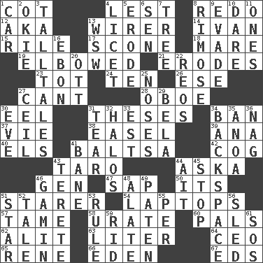 ACROSS 1. Small bed 4. For fear that 8. Do over again 12. Alias (abbr.) 13. One who wires 14. _ the terrible 15. Cause heat under the collar 17. Biscuitlike quick bread 18. Female horse 19. Shoved, as through a crowd 21. Eats (away) 23. Small child 24. "___ Little Indians" 26. Compass dir. 27. Patter 28. Mitch Miller's instrument 30. Snakelike fish 31. College papers 34. Bar 37. Compete 38. Artist's stand 39. Santa ___, CA 40. Raised railways 41. Greek mezzo-soprano Agnes 42. Gear tooth 43. Edible starchy tuberous root 44. "____ silly question..." 46. Commissioned military rank (abbr.) 47. Plant excrement 50. ___ a Wonderful Life 51. A viewer who gazes fixedly 54. Portable computers 57. Not wild 58. A salt of uric acid 60. Friends 62. Set down 63. 61 cubic inches 64. Corporate head (abbr.) 65. French philosopher Descartes 66. Paradise 67. Begley and Asner DOWN 1. Automobile 2. Migrant worker of the '30s 3. Baron Munchausen's specialties 4. It is permitted: Lat. 5. Wear away 6. Elected rep. 7. Woody plant 8. Full of chinks, cracks, or crevices 9. Dodge 10. Have the gumption 11. Singles 13. Compass dir. 16. Inky black, to poets 20. Baseball player Mel 22. Vintage cars 25. Olfactory organs 27. To provide with a ceiling 29. Actor Lugosi 30. Night before a holiday 31. Separate forcefully 32. Auras 33. Eastern Standard Time (abbr.) 34. Keyboard key 35. Small Philippine buffalo 36. Tired old horse 41. Object of repulsion 43. Cigar-shaped 44. Small island 45. Halt 46. Street urchin 48. Having winglike extensions 49. Eucharist need 51. Play the lead 52. Lie 53. General guideline 55. For each 56. Downhill vehicle 59. To free from 61. Distress signal