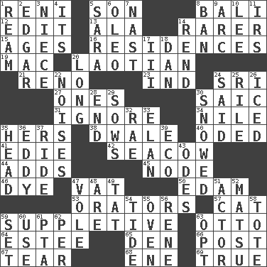 ACROSS 1. Painter Guido (1575-1642) 5. Boy, to dad 8. Indonesian resort city 12. Prepare for publication 13. Chicken ___ king 14. More uncommon 15. Eons 16. Dwellings 19. Big _ 20. Of or relating to Laos or its people 21. Former U.S. Attorney General Janet 23. Working for oneself (abbr.) 24. _ Lanka 27. Singles 30. Ketch in the Levant 31. Refuse to acknowledge 34. The longest river in the world 35. Possessive pronoun 38. A sleeping potion; an opiate (poet.) 40. Wrote a lyric poem 41. Singer Brickell 42. Manatee 44. Does sums 45. Connecting point 46. Color 47. Large container 50. Dutch treat 53. Speakers 57. Domesticated feline 59. Supplying deficiencies 63. "Beetle Bailey" pooch 64. First name in cosmetics 65. Lair 66. Mail 67. Pull into pieces 68. Compass dir. 69. Loyal DOWN 1. 480, 500 or 516 sheets of paper 2. _ Allan Poe 3. Sibling's daughter 4. ___ a Wonderful Life 5. "Two Mules for Sister ____" 6. Butter sub 7. Political cartoonist Thomas 8. Forbid 9. Curve 10. Area sheltered from the wind 11. Big collection agency 14. Tear apart 17. One more than two 18. Daniel's nick name 20. Yearn 22. Annoying sounds 24. Stated 25. Cause heat under the collar 26. On the rocks 28. Conclusion 29. Sty mamas 30. Overwhelmed 32. Actress Charlotte 33. Style 35. Froth on beer 36. Whirlpool 37. Travel on or in a vehicle 39. Environmental prefix 43. Lyric poems 47. Short-tailed, large-bodied rat 48. "We ___ not amused" (Victoria) 49. Make lace 51. Thespian 52. Taiwanese island in East China Sea 54. Periodic rise and fall of the sea level 55. Baking chamber 56. French philosopher Descartes 58. Carry 59. Put into a specified state 60. Purpose 61. Parent Teacher Association (abbr.) 62. For each 63. Choose