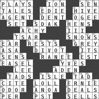 ACROSS 1. Frolics 6. Electrically charged atom 9. Elected rep. 12. Stories 13. Singer Brickell 14. Hub of activity 15. Representative 16. Undesirable depression on a surface 17. Double curve, resembling the letter S 18. Arrange properly for use 19. Neighbor of Neb. 20. Coop moms 21. Painful 23. One more than two 24. Russian ruler of old 25. Frozen precipitation (plural) 28. Ewer handle 30. Musical pauses 34. Jennifer or Joel 35. White ___ sheet 36. A piece of turf (Scot.) 38. ___ a Wonderful Life 39. Elected reps. 41. Indian princess (variant) 43. Eastern Standard Time (abbr.) 44. Artist's stand 46. Jacques Cousteau's middle name 48. Area sheltered from the wind 49. Arabian gulf 50. Small boys 51. Capri or Wight 53. Bit 56. Quote 57. Hang loosely or laxly 58. Bert's buddy 60. Scent 61. Small Philippine buffalo 62. Allots cards 63. For each 64. Pacific Standard Time (abbr.) 65. Exchanges for money DOWN 1. Parent Teacher Assoc. 2. Falls behind 3. Toward shelter 4. Gossips 5. Fast jet (abbr.) 6. The content of cognition 7. Pig sound 8. Remaining after all deductions 9. Seigniories (variant) 10. Nights before holidays 11. Born 13. Whirlpool 14. Cultivating 19. Tear up 20. Part of HMS, perhaps 22. 4-wheeled motor vehicle 24. Interpreter 26. Soaks 27. System (abbr.) 28. Relaxation 29. At sea 31. Title for a knight 32. Federal power corp. 33. Boy, to dad 37. Miss Universe 1986, Barbara Palacios _ 40. Sowing specialist 42. First lady 45. French article 47. Main course 49. Silent film actress Nazimova 50. Event that recurs at intervals 51. Charged particles 52. Narrow opening 54. Of or related to the anus 55. Deli pickle 56. Police officer (slang) 57. Pet locale 58. Begley and Asner 59. Double-curved letter