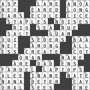 ACROSS 1. Viper 4. Unable to walk 8. Small Philippine buffalo 12. Modern: prefix 13. Having ears or earlike features 14. Having great length 15. Hearing organs 17. Learning spot: Fr. 18. Louse (plural) 19. Paper fasteners 21. Annoying sounds 23. _ de Janeiro 24. Ocean 26. Sorrow 27. Table seasoning 28. Island territory of the United States 30. Fr. "Yes" 31. Spring feasts 34. Sound made by sheep 37. Fish or hair follower 38. Amid 39. Everything 40. Curvy letter 41. Make 42. Small bed 43. NW Algerian seaport 44. Cause to be 46. "We ___ not amused" (Victoria) 47. Male parent 50. Followers of ems 51. Burden 54. Portable computers 57. Toward shelter 58. Empty; void 60. Nathan's nickname 62. Nanny 63. Prevent from occurring 64. Island 65. Taken by mouth 66. Perceives with the eye 67. Compass dir. DOWN 1. One (Scot) 2. Oceans 3. Likenesses of persons 4. Shoestrings 5. Came up 6. Cartoonist voice _ Blanc 7. Paradise 8. Plant genus of onion and garlic 9. Annoying sound 10. Single time 11. Grows older 13. Snakelike fish 16. Move on water 20. Plant holder 22. Mouths or openings 25. Rep 27. Institutes legal proceedings 29. Goad 30. Single 31. "Two Mules for Sister ____" 32. Make improvements or corrections to 33. ___ good deed 34. Keyboard key 35. _ vera 36. Keyboard modifier key 41. Algonquian 43. Severe or trying experience 44. Was introduced to 45. Soon (poet.) 46. Sports stadium 48. Having winglike extensions 49. Natives or inhabitants of Denmark 51. Papal veil 52. Having or resembling wings 53. Flaplike coverings 55. For each 56. Comedian Laurel of Laurel & Hardy 59. Born 61. Sight organ